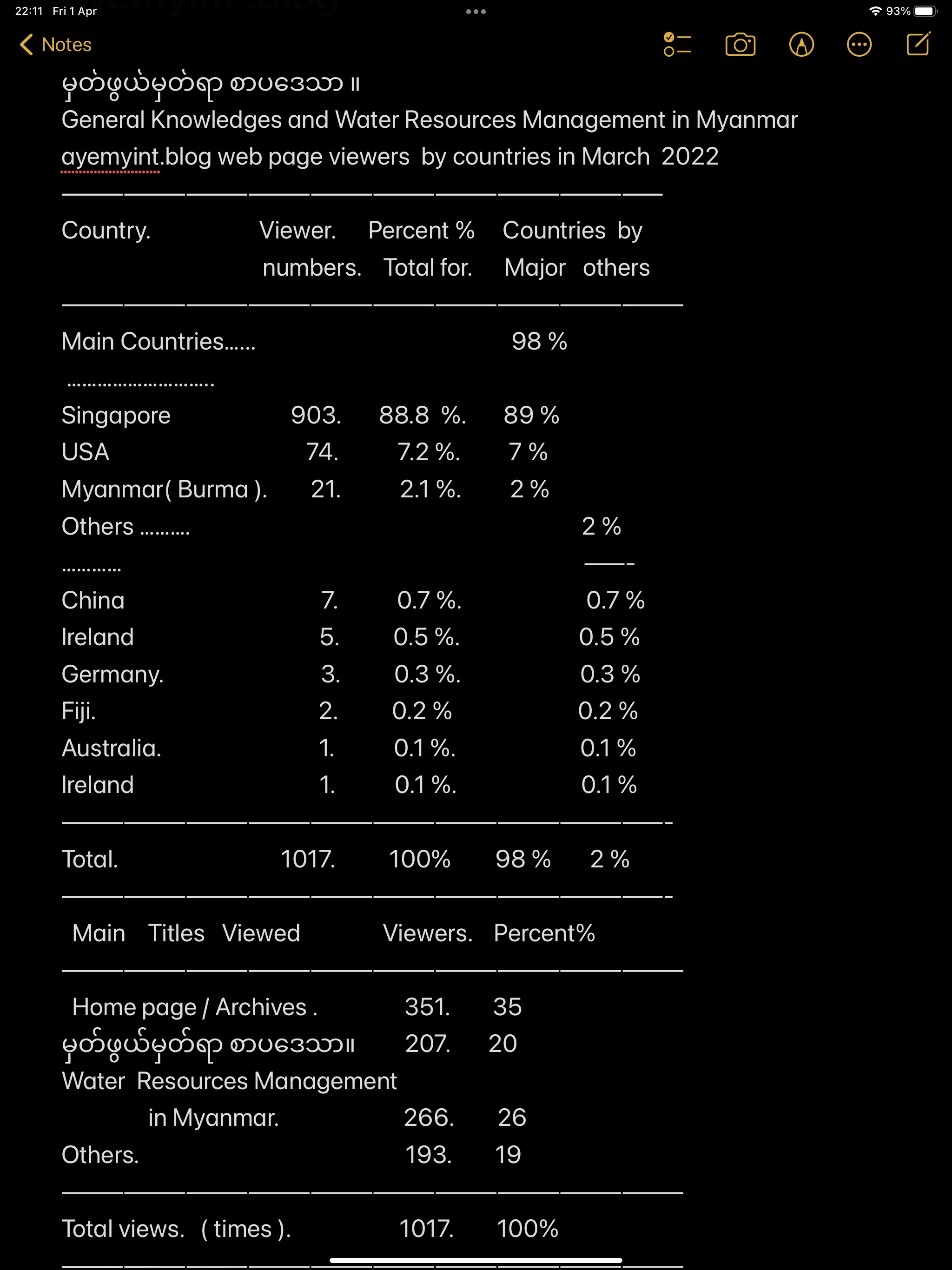 မှတ်ဖွယ် မှတ်ရာ စာပဒေသာ နာမည် နဲ့ General Knowledges and Water Resources Management in Myanmar ဆိုပြီး ဝက်ဆိုက် မှာတင်ထားတဲ့ ဗဟုသုတ ဖြစ်ဖွယ်ရာ ဆောင်းပါး အလိုက် စာဖတ် သူ ဦးရေကိုပါ မြင်နေရပါ ပြီ ။