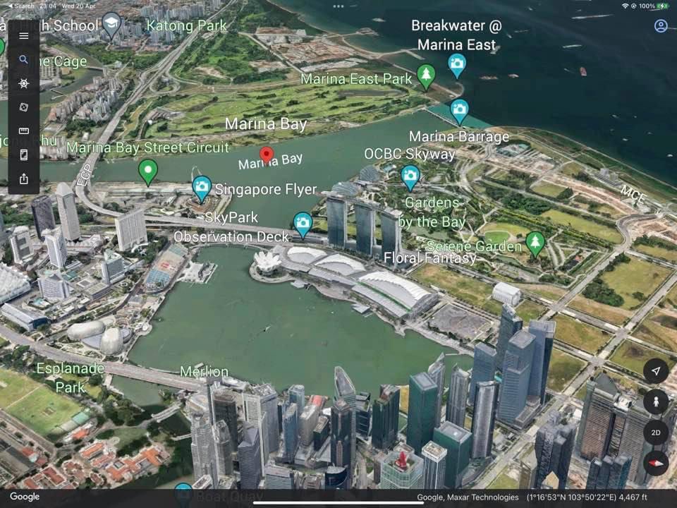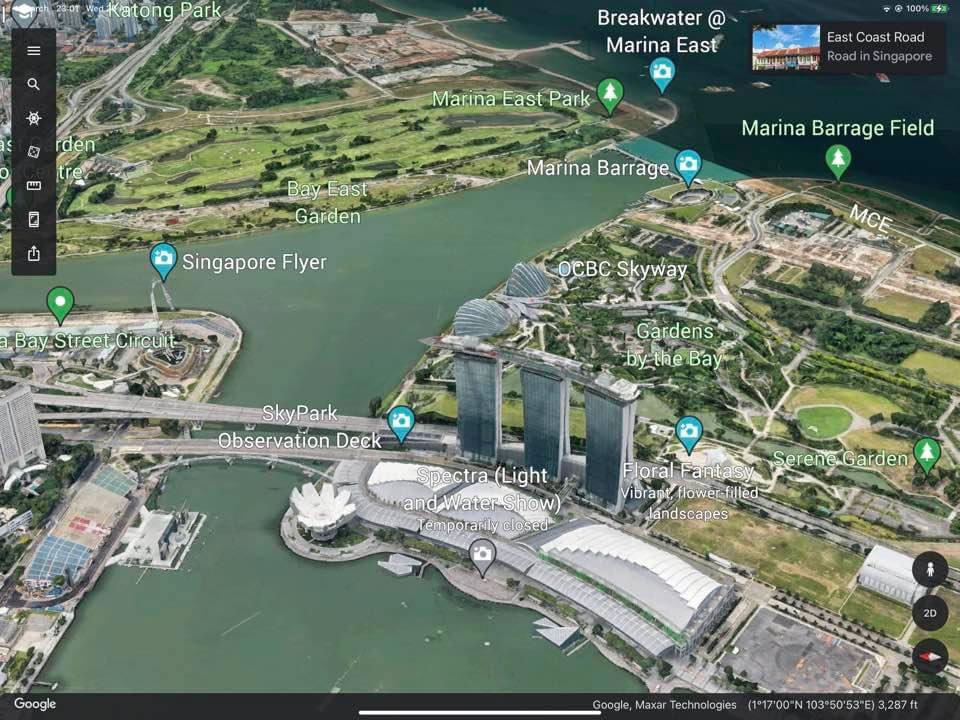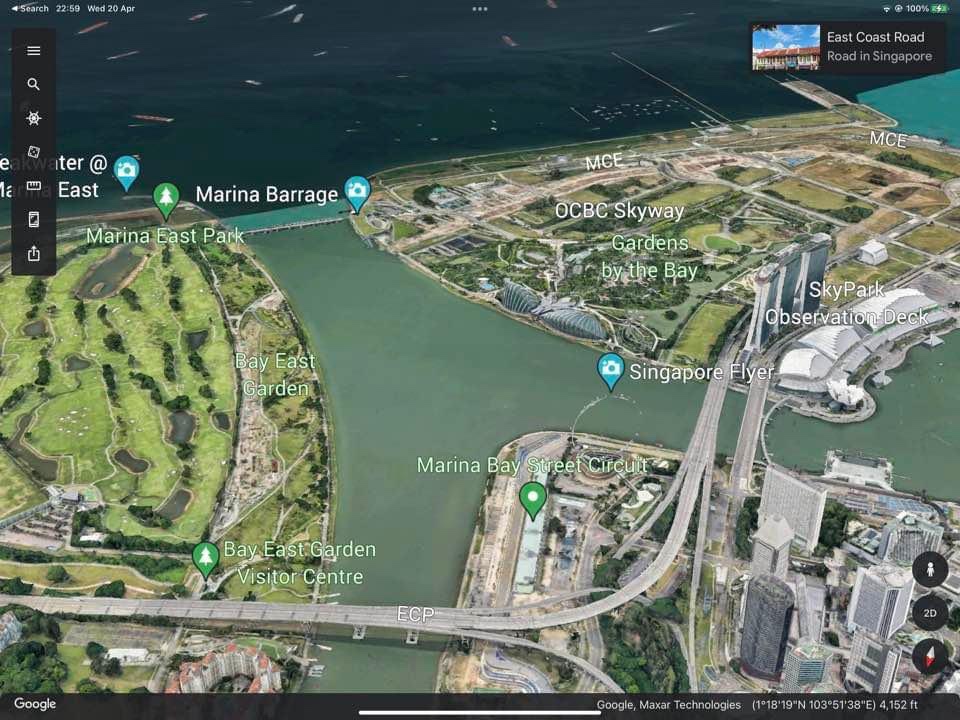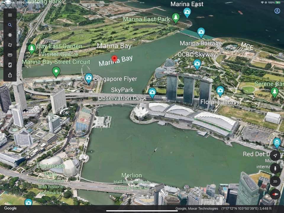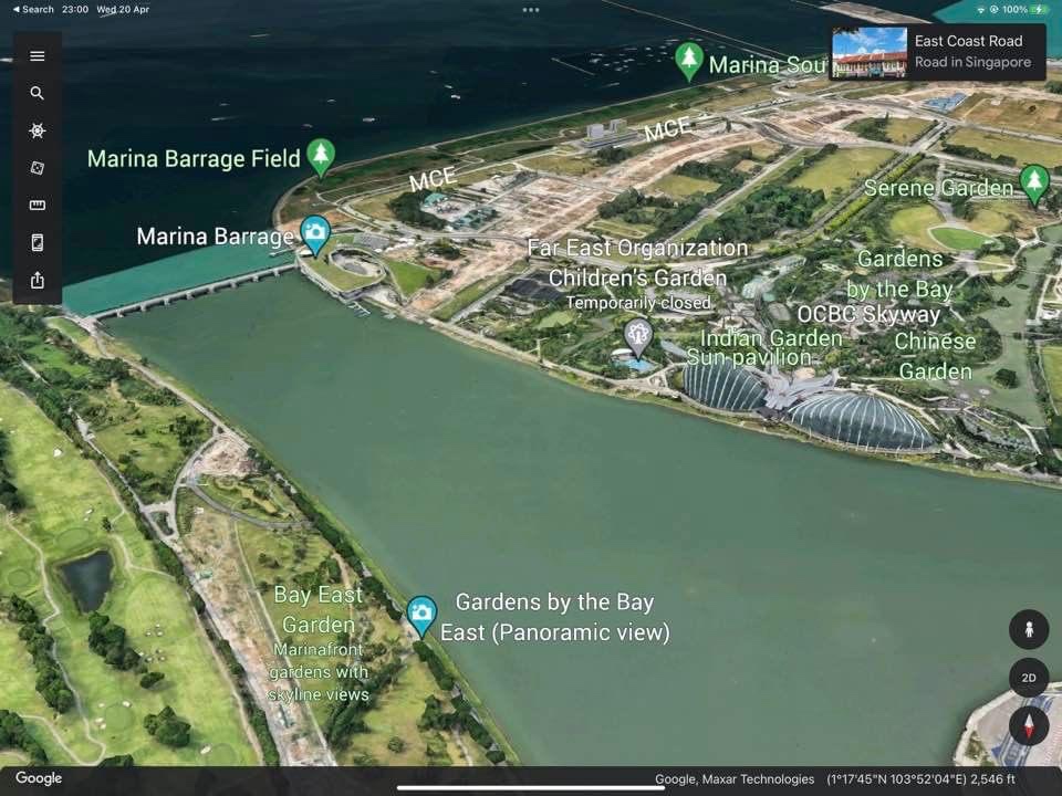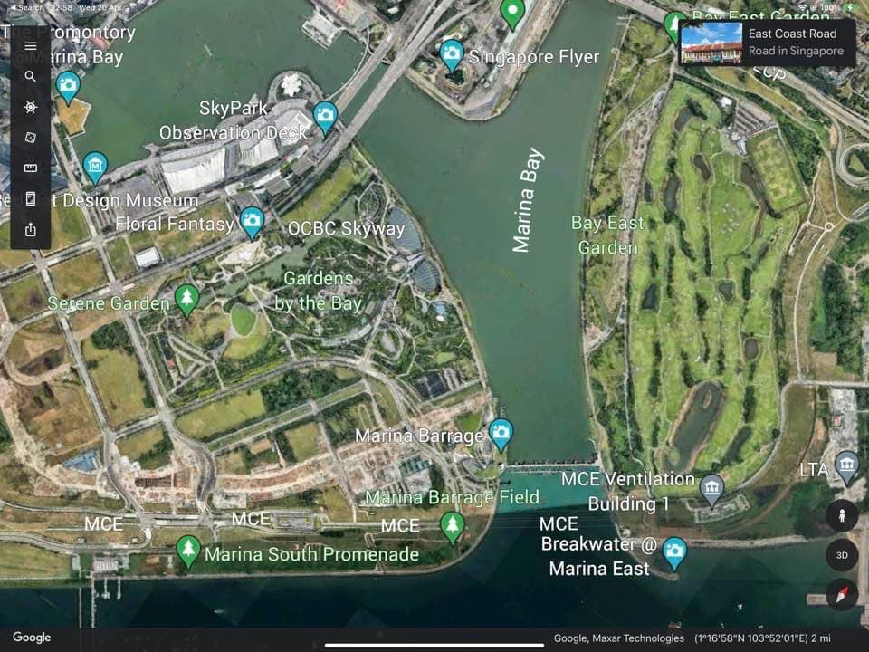 Marina Barrage ရေတံခါး၏ တည်နေရာ Google Earth ကောင်းကင် ဂြိုလ် တု ပုံ များ ကို ပါ ပူးတွဲ ဖေါ်ပြလိုက်ပါတယ် ။