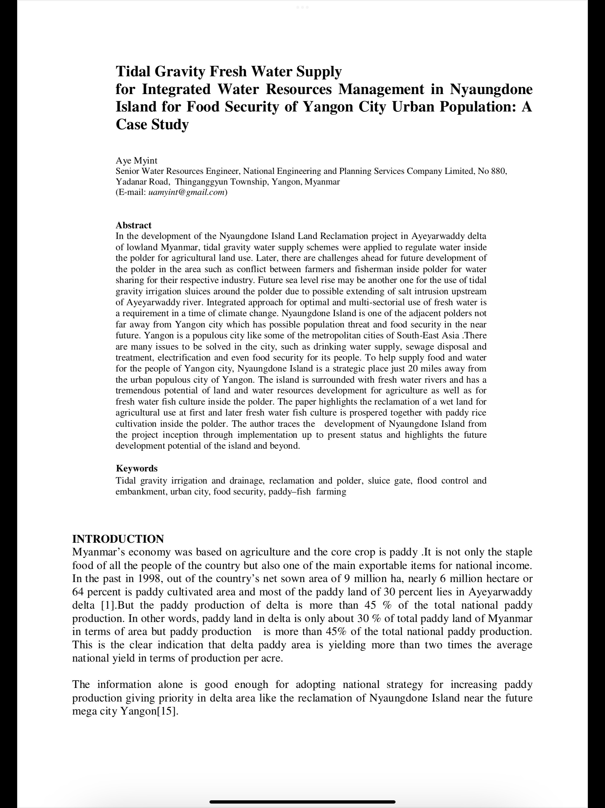Tidal Gravity Fresh Water Supply for Integrated Water Resources Management in Nyaungdone Island for Food Security of Yangon City Urban Population: A Case Study