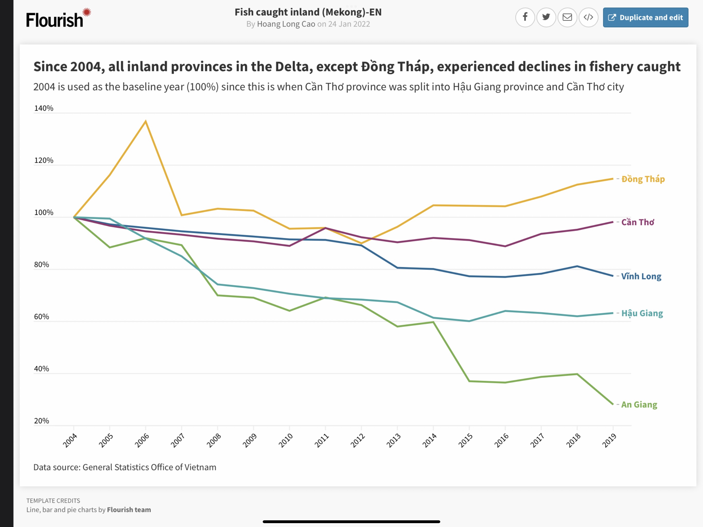 An Giang province, Muoi Diep’s homeland, has also seen the largest decrease in the quantity of fish caught in VMD compared to 15 years ago. In 2019, fish catch in An Giang was only 28%—less than a third—of its catch in 2004.
