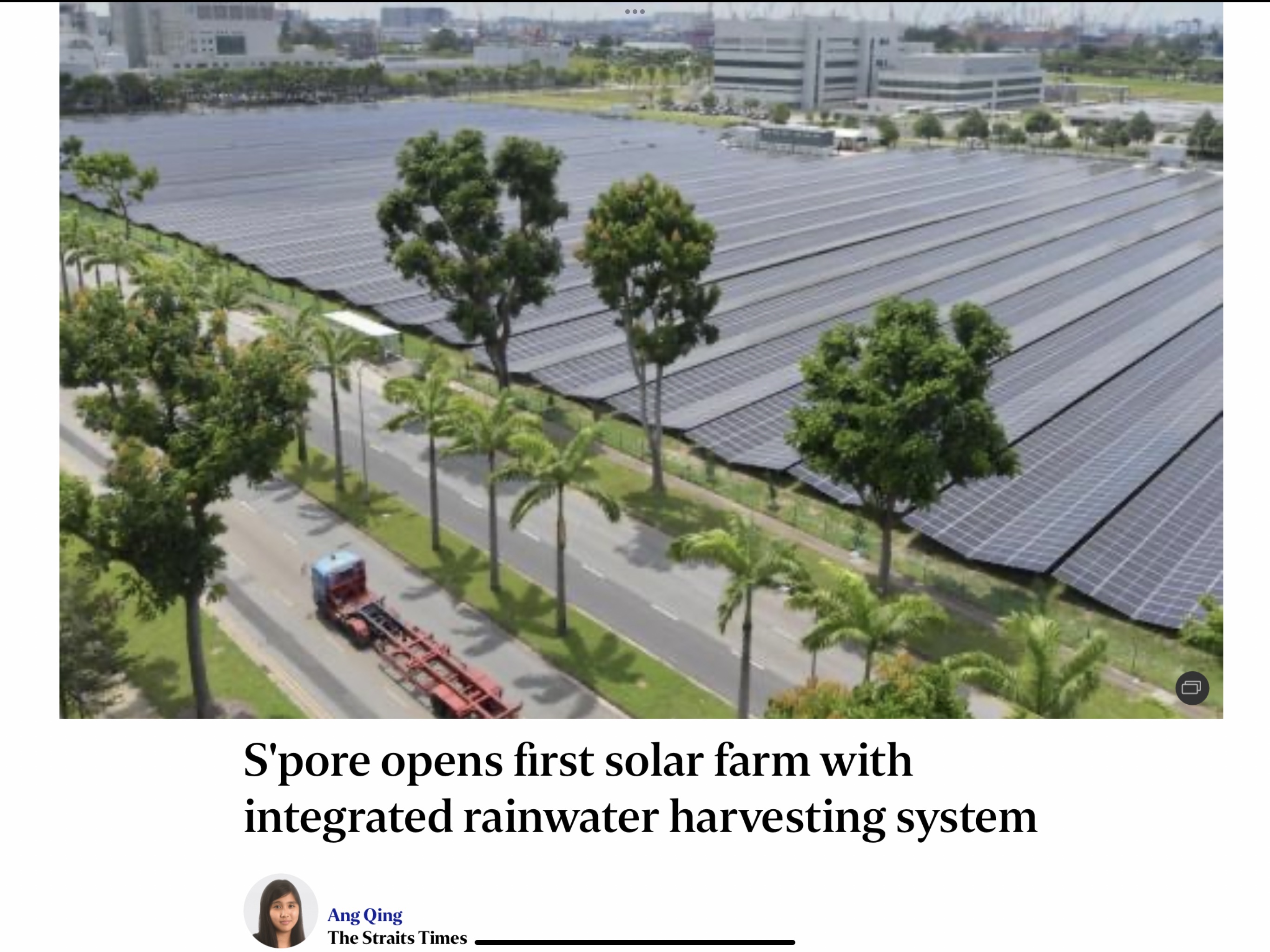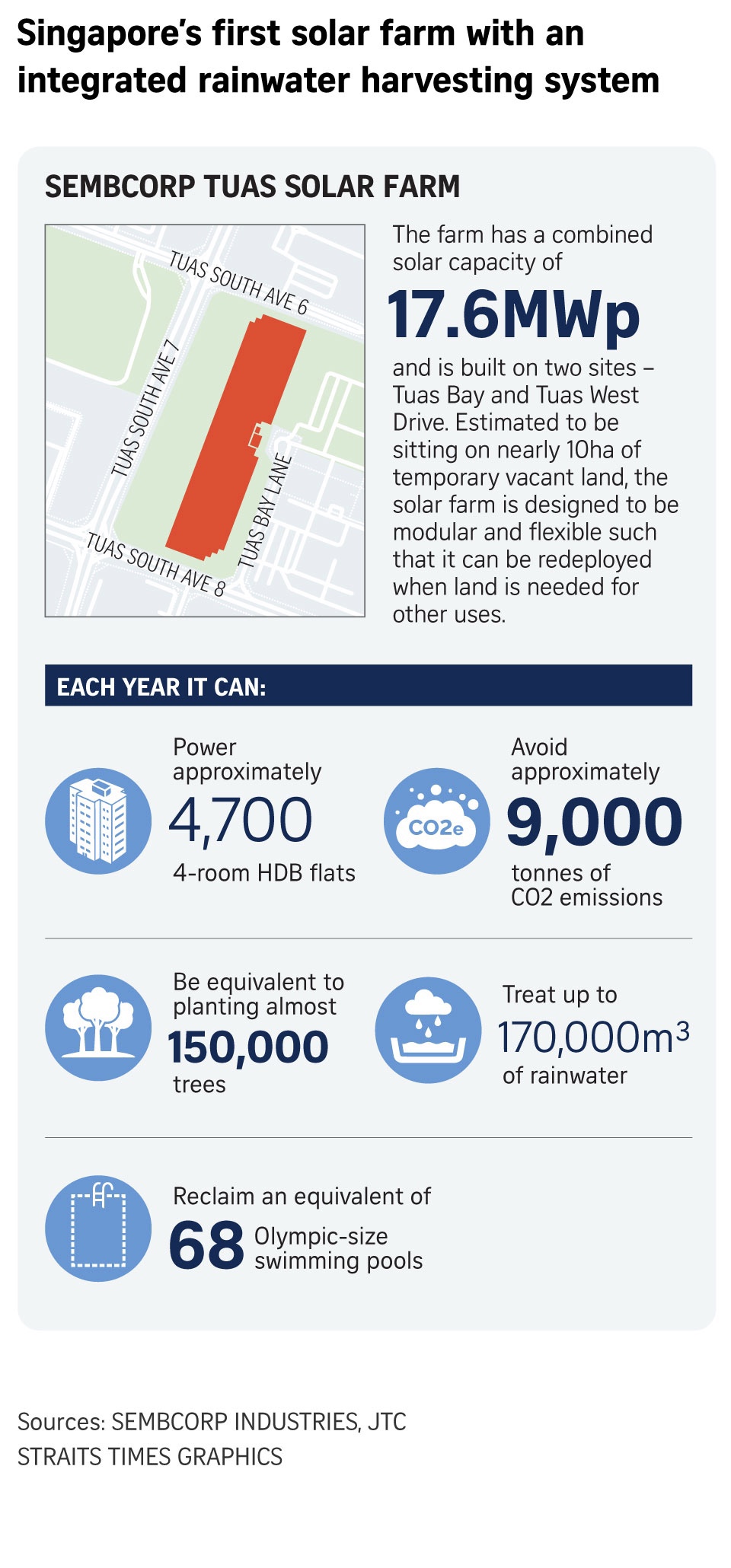 SINGAPORE – Sitting on almost 10ha of temporary vacant land, Singapore’s first solar farm with an integrated rainwater harvesting system was officially opened by Sembcorp in Tuas on Friday (May 6).