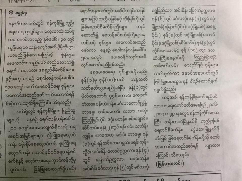 ရန်ကုန်မြို့တော် စည်ပင်သာယာရေး အဖွဲ့ က အနာ ဂတ် ရန်ကုန်အတွက် သောက်သုံးရေပို ရအောင် မြစ်ရေတင်စီမံကိန်းတွေနဲ့ ဖြည့် စွက် လျာထားစီမံနေတာ တွေ့ နေ ရပါတယ် ။