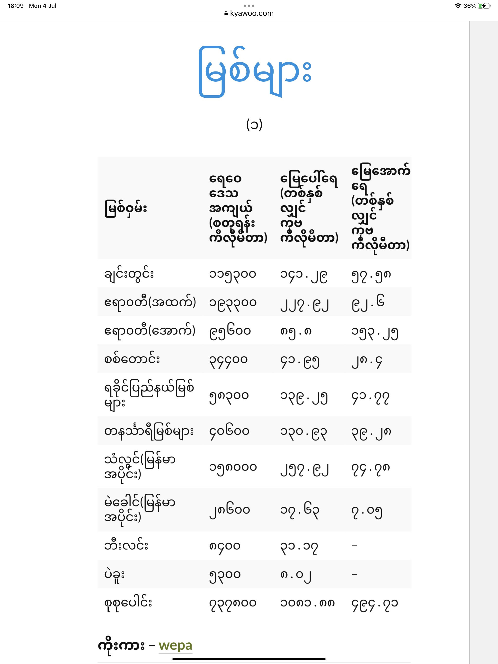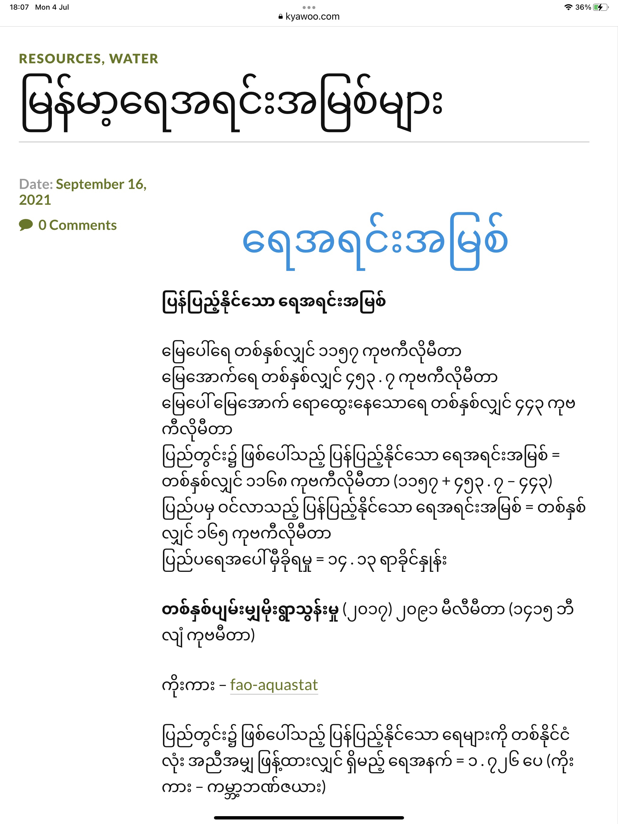 ဤနေရာ https://kyawoo.com/2021/09/16/မြန်မာ့ရေအရင်းအမြစ်မျာ/ ကို နှိပ်၍ ဝင်ရောက် လေ့လာ အကဲဖြတ် ဝေဖန်ကြရန် ဖြစ်ပါသည်။