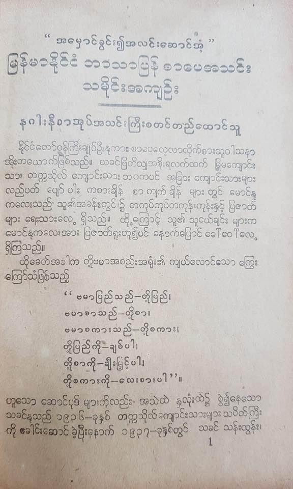 “ တို့ဗမာ”�“ ဗမာပြည်သည် –တို့ပြည် ၊�ဗမာစာသည် –တို့စာ၊�ဗမာစကားသည် —တို့စကား ၊�တို့ပြည်ကို —ချစ်ပါ၊�တို့စာကို —ချီးမြှင့်ပါ၊�တို့စကားကို—လေးစားပါ ။ “