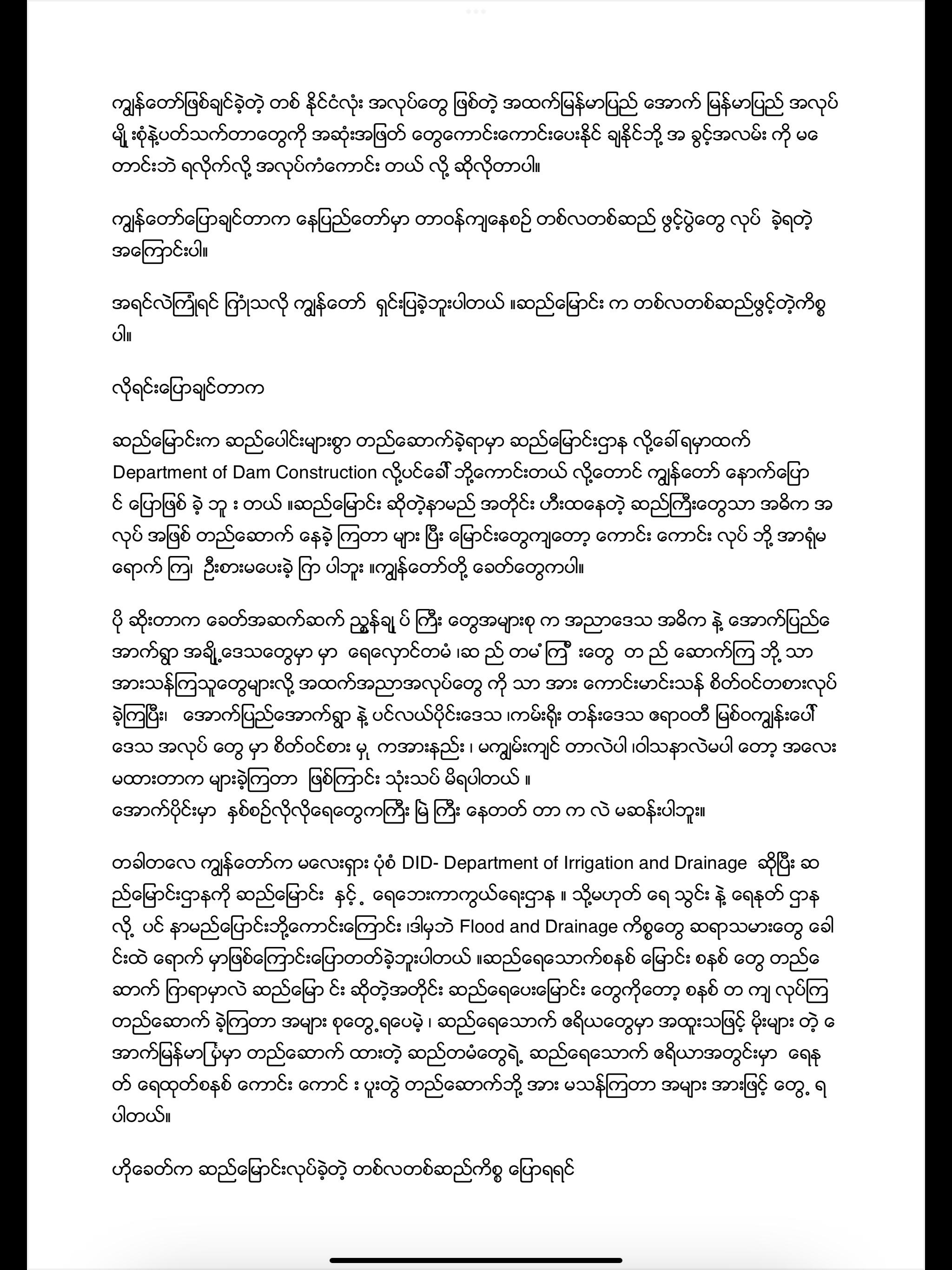 ဒီအချက် နဲ့ပတ်သက် လို့ ၊ ဆရာသမား ကို မိမိတို့ ဆည် မြောင်းမှာ ဆည်တမံတွေကို တစ်လ တစ်ဆည် တည် ဆောက် နေတာမဟုတ်ဘဲ ၊ တစ်လတစ်ဆည် ဖွင့် ပွဲတွေလုပ်နိုင်အောင် သာ ၊စီစဉ် နေ ခဲ့ကြတာ ဖြစ်ကြောင်း ဆရာသမားသိအောင် ဆည် မြောင်းဘက်က ရှေ့ နေလိုက် ပြီး စာရှည်ကြီး ရေးသား ဖြစ် ခဲ့ပါတယ်။
