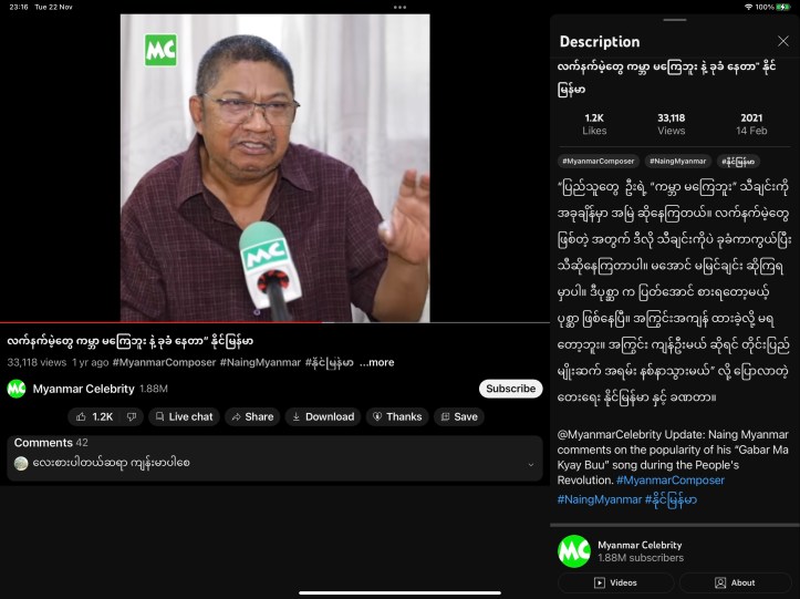 22 Nov 202222 Nov 2022 uamyint နိုင်မြန်မာ ရဲ့ ကမ္ဘာ မကြေဘူး www.facebook.com/573223149/posts/pfbid0UM7TyhM8pq3weACixF9fGhqjZJDadYYsLgUa7ZjeLYnp4eyMYkzYD9kkQ3cSad7El/ https://youtu.be/UXjSqA8v24s ၁၉၈၈ အရေးအခင်း က ထွက် ပေါ် ခဲ့ တဲ့ သီချင်း ၊ နိုင်မြန်မာ ရဲ့ ကမ္ဘာ မကြေဘူး Click to share on Facebook (Opens in new window) Facebook Click to share on X (Opens in new window) X Click to share on LinkedIn (Opens in new window) LinkedIn Click to share on Telegram (Opens in new window) Telegram More Click to share on Tumblr (Opens in new window) Tumblr Like Loading... Related