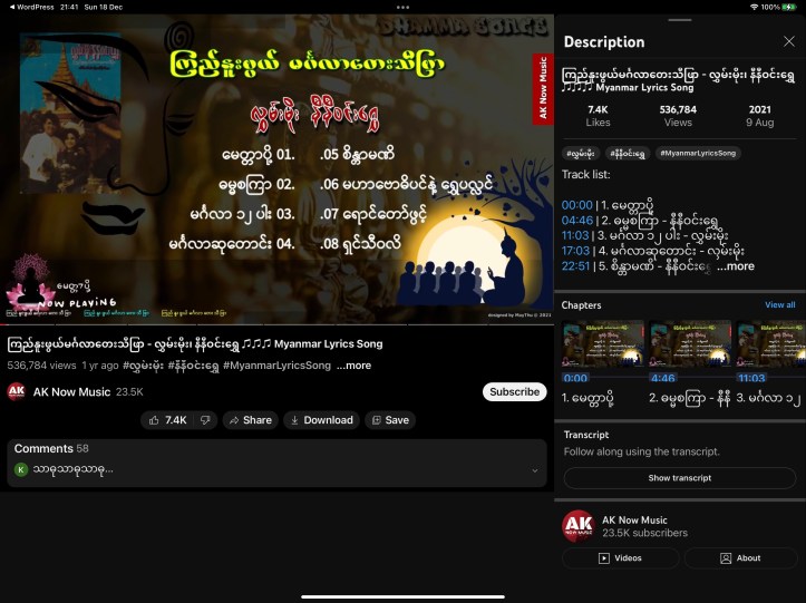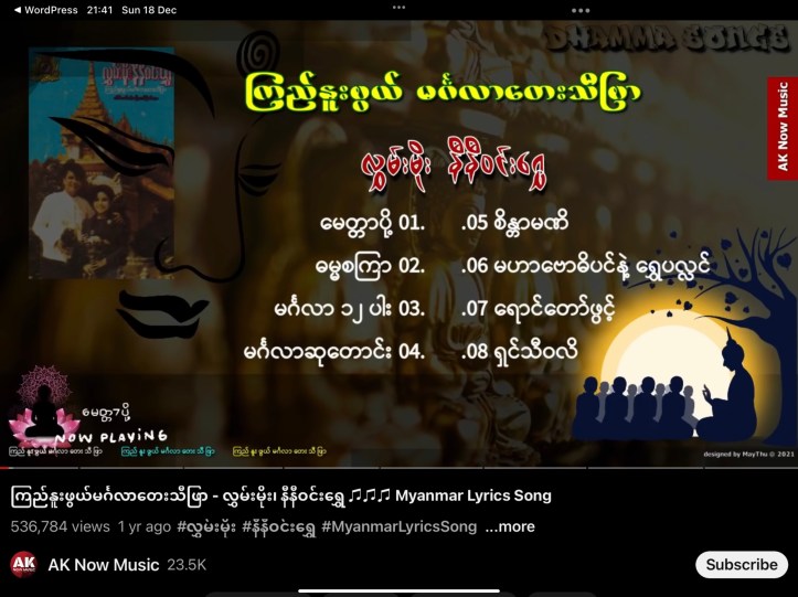 18 Dec 202225 Dec 2022 uamyint ဘာသာရေး သာသနာရေး ဓမ္မ တေးများ – ၁၀ ။ လွှမ်းမိုး နှင့် နီနီဝင်း ရွှေ တို့၏ ကြည်နူးဖွယ် မင်္ဂါလာ တေး သီဖြာ youtube.com/watch ဘာသာရေး သာသနာရေး ဓမ္မ တေးများ – ၁၀ ကြည်နူးဖွယ် မင်္ဂါလာ တေး သီဖြာ လွှမ်းမိုး နှင့် နီနီဝင်း ရွှေ Share on Facebook (Opens in new window) Facebook Share on X (Opens in new window) X Share on LinkedIn (Opens in new window) LinkedIn Share on Telegram (Opens in new window) Telegram More Share on Tumblr (Opens in new window) Tumblr Like Loading... Related