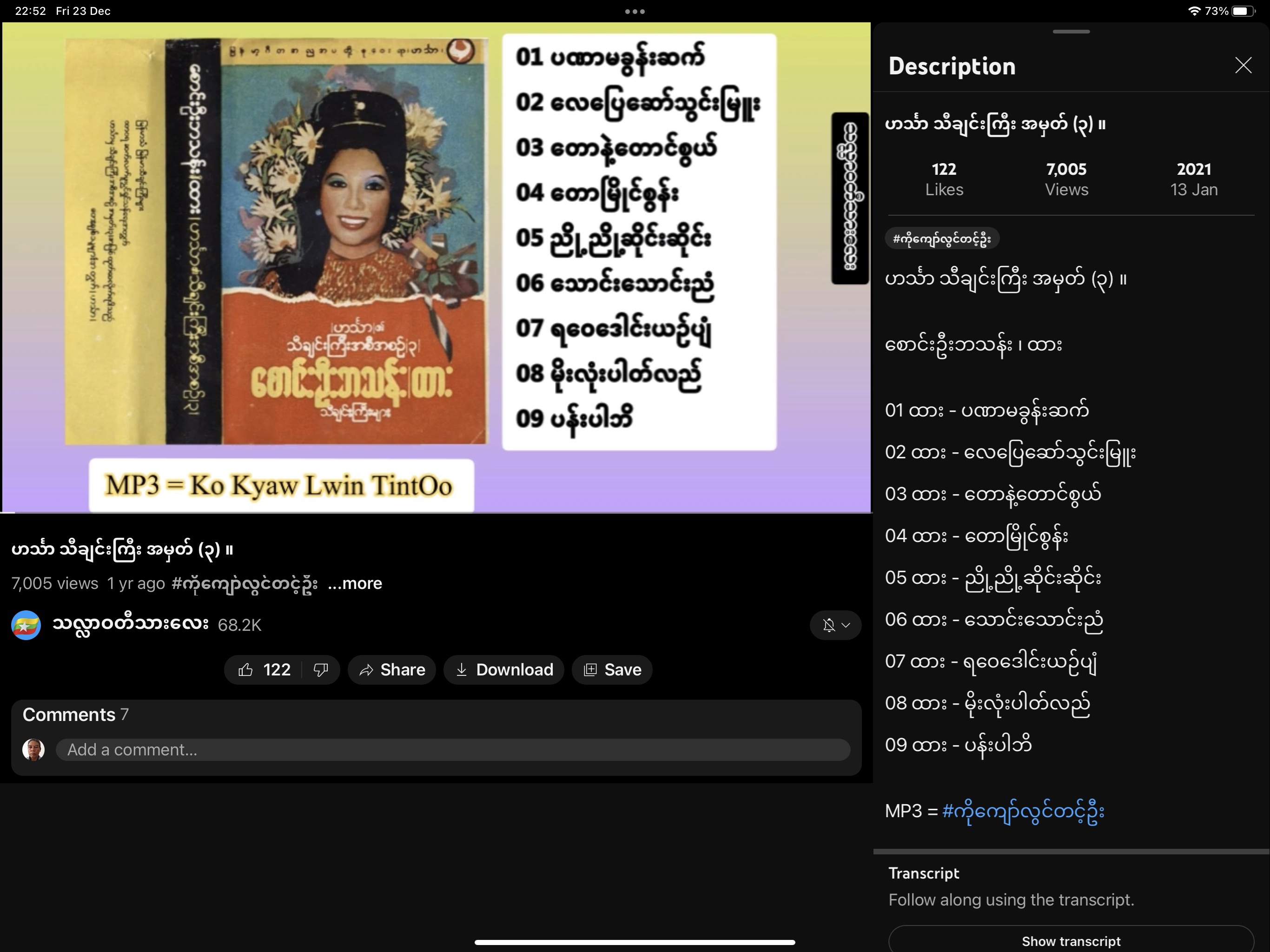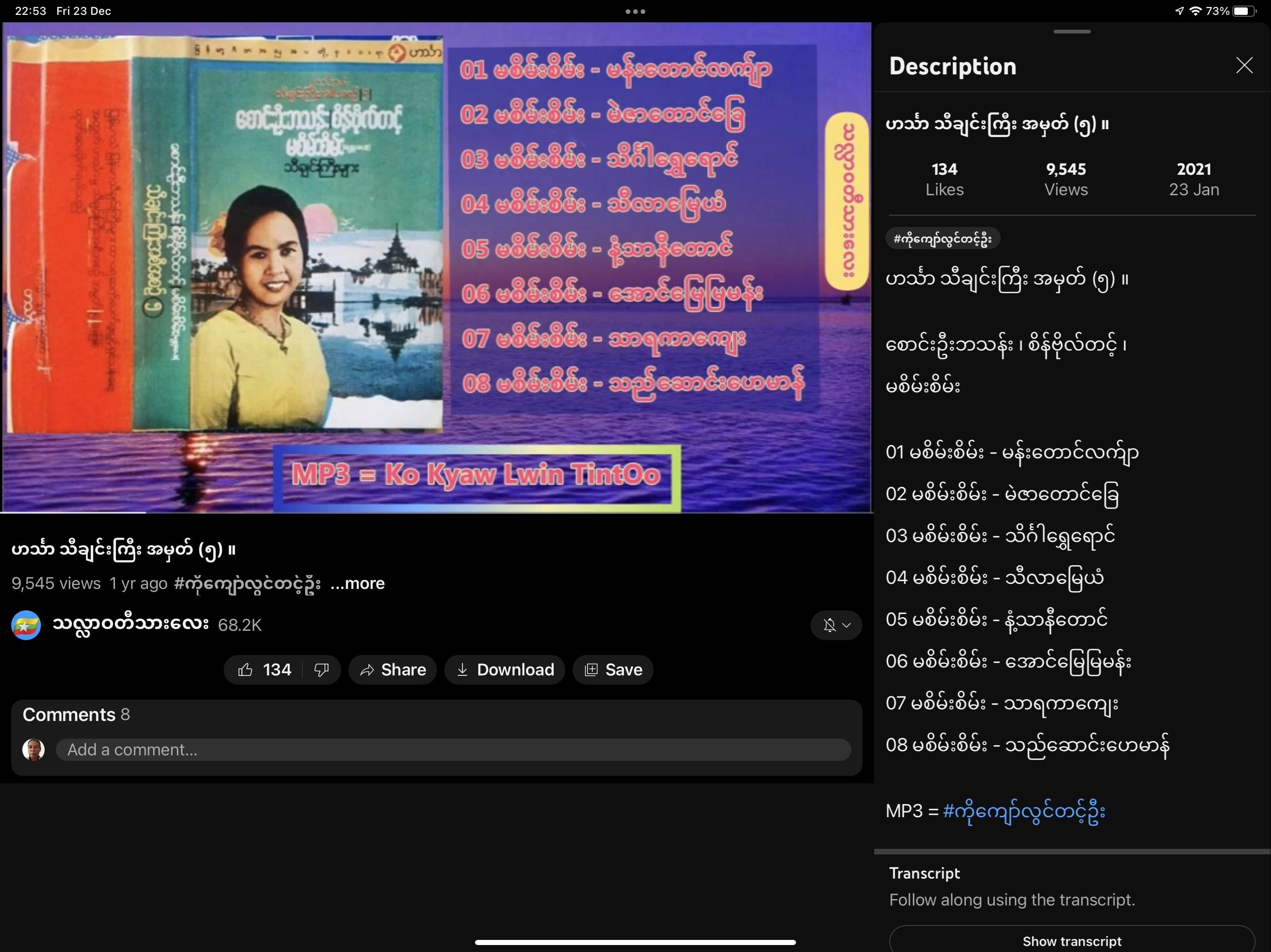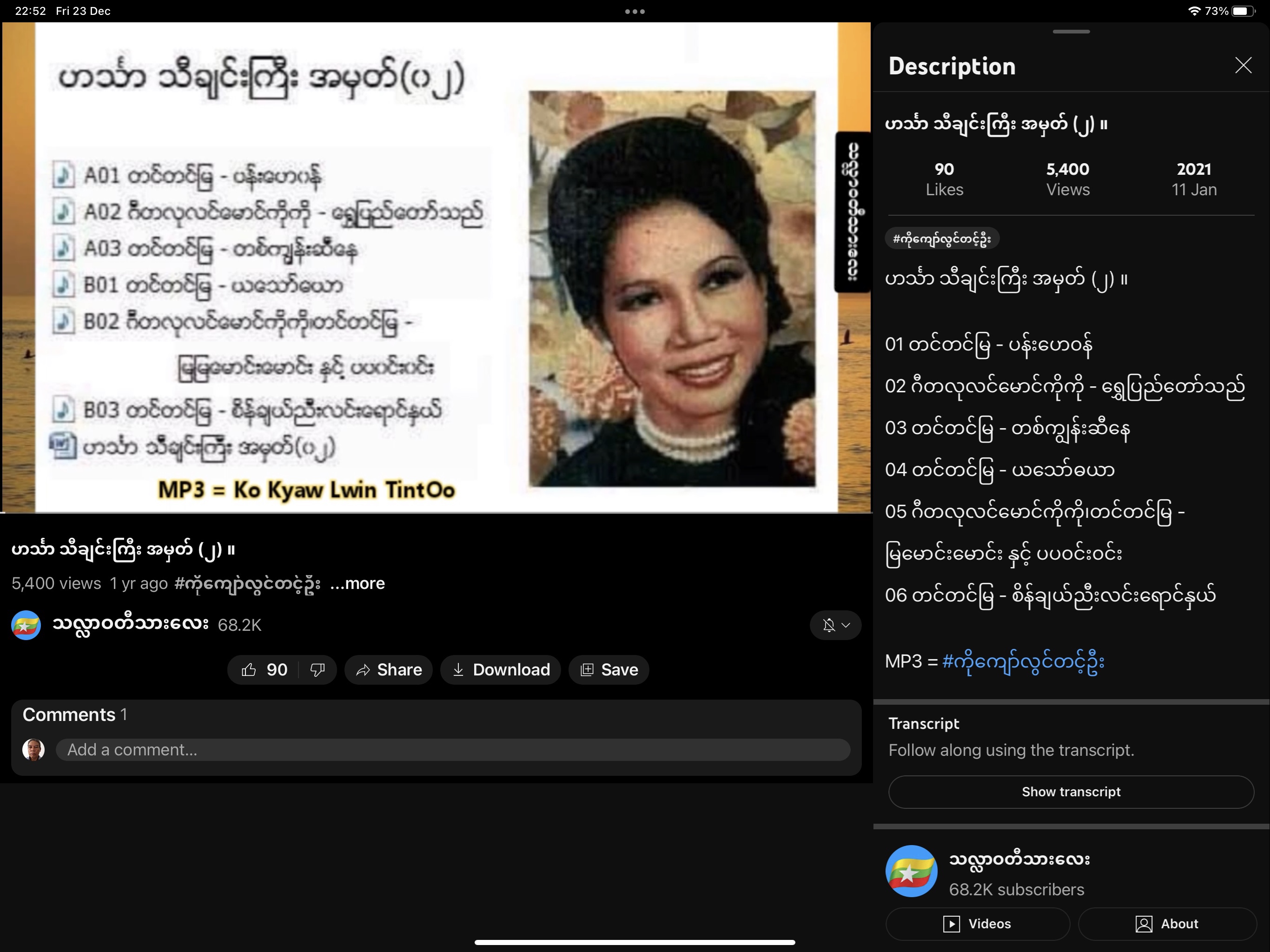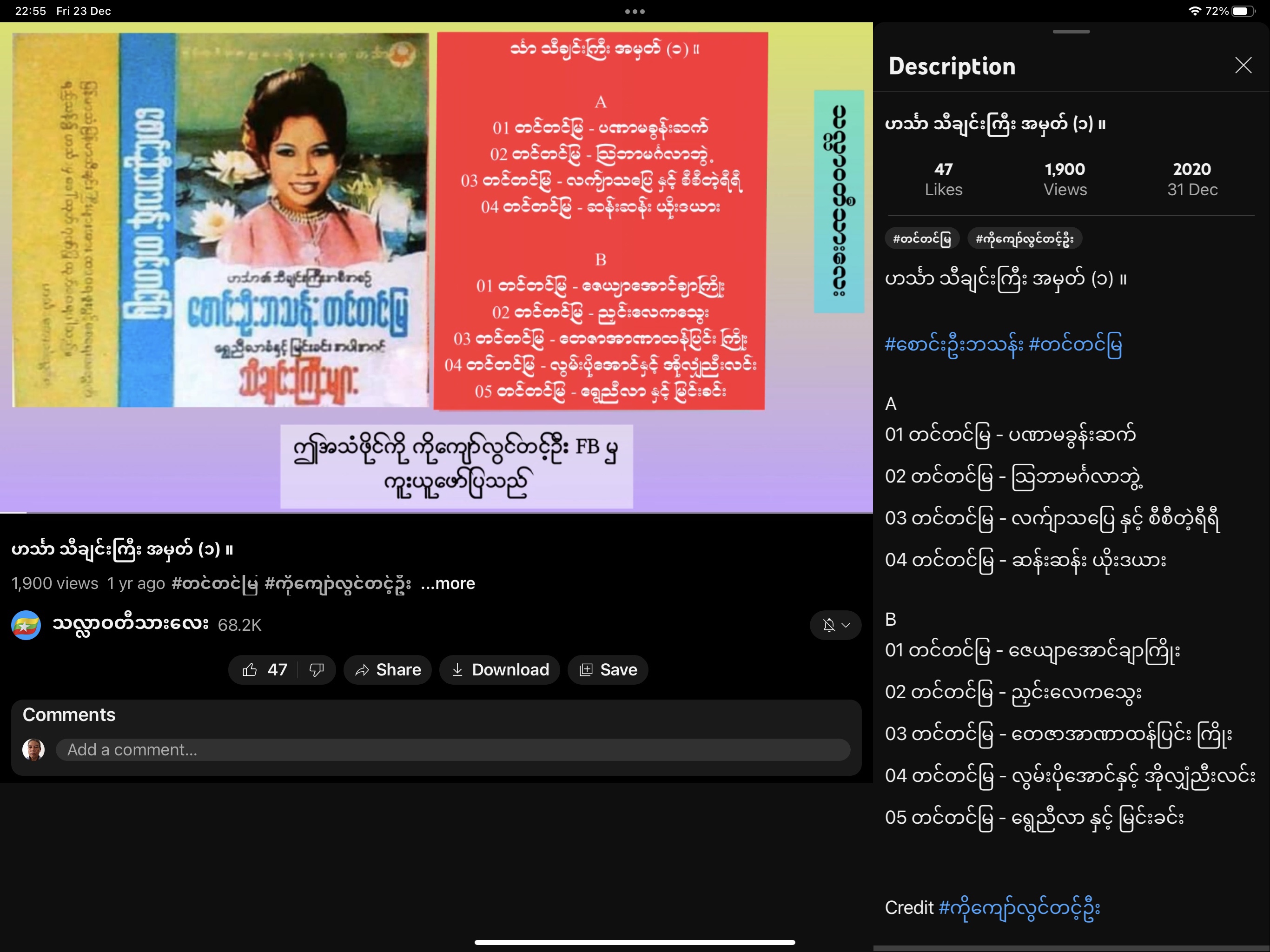 24 Dec 202218 Aug 2024 uamyint မြန်မာ့ မဟာဂီတသီချင်းကြီးများ ။ ဟင်္သာ တေးသံသွင်းမှ ထုတ်လွှင့်ခဲ့သော သီချင်းကြီးများ စုစည်းမှု ( ၂ / ၄ ) https://youtu.be/OLr4cB3YH6M https://youtu.be/WWWT0vlbvY0 https://youtu.be/OyIhPldf8GA Click to share on Facebook (Opens in new window) Facebook Click to share on X (Opens in new window) X Click to share on LinkedIn (Opens in new window) LinkedIn Click to share on Telegram (Opens in new window) Telegram More Click to share on Tumblr (Opens in new window) Tumblr Like Loading... Related