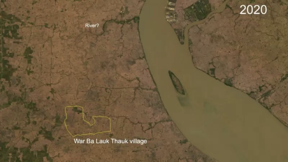 (အောက်ပုံတွေမှာနှစ်ပေါင်း၃၀ကျော်အတွင်းသခွတ်ချောင်းတိုဝင်သွားပြီးဝါးဘလောက်သောက်ရွာနဲ့ဝေးကွာသွားပုံကိုတွေ့နိုင်ပါတယ်။) (ဓာတ်ပုံ – ဘီဘီစီ)