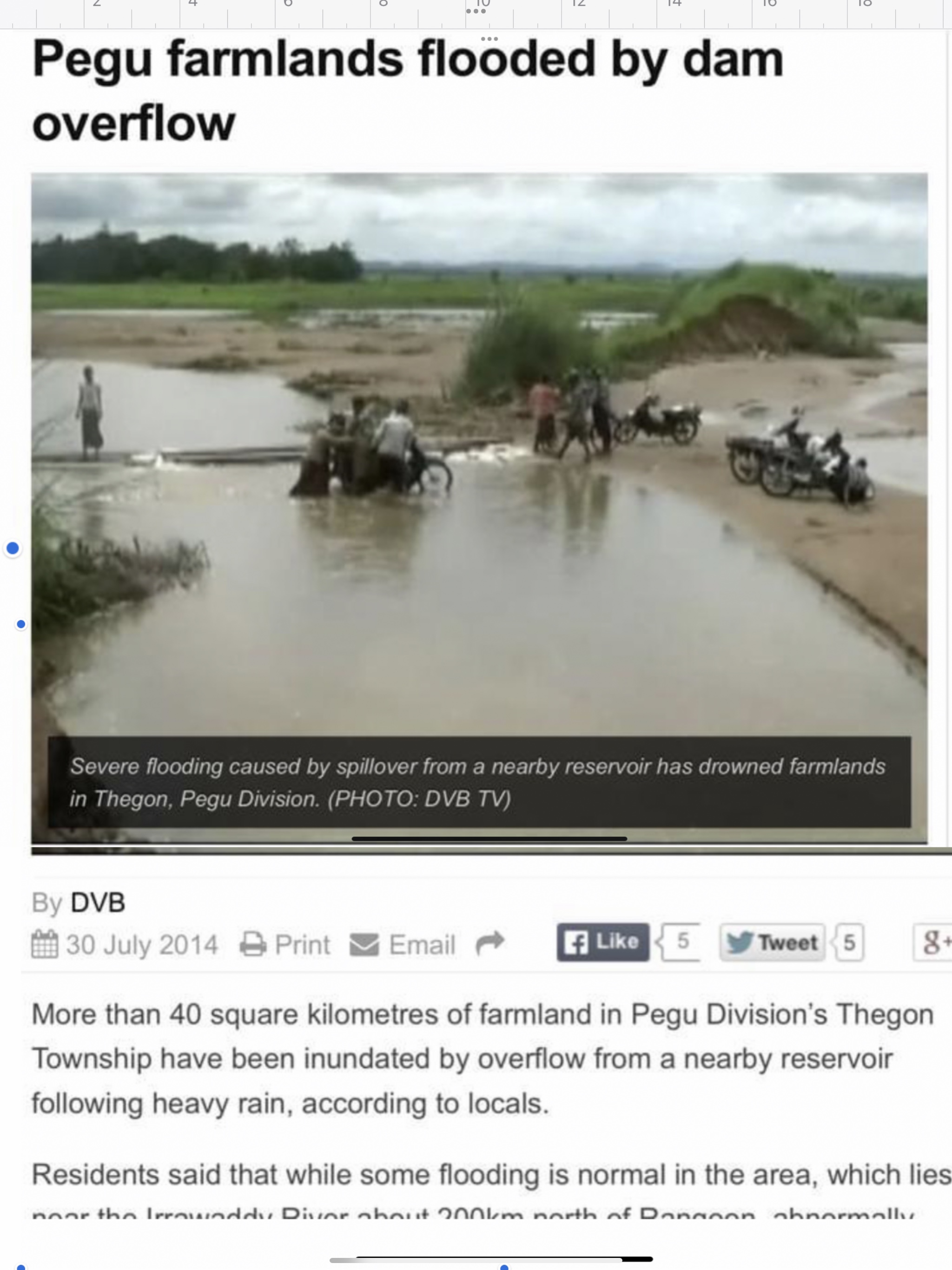 ပဲခူးတိုင်းဒေသကြီးအတွင်းရှိ ဆည်ရေသောက်ဧရိယာများထဲမှ တစ်ခုဖြစ်သော လယ်မြေများအတွင်းသို့ ရေလွှမ်းမိုးနေတဲ့ သတင်းတစ်ပုဒ်ပါ။