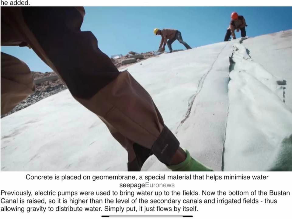To reduce water losses, the bottom, as well as the banks of the 70 kilometres-long Bustan Canal, were concreted. Concrete was placed on geomembrane, a special material that helps minimise water seepage.