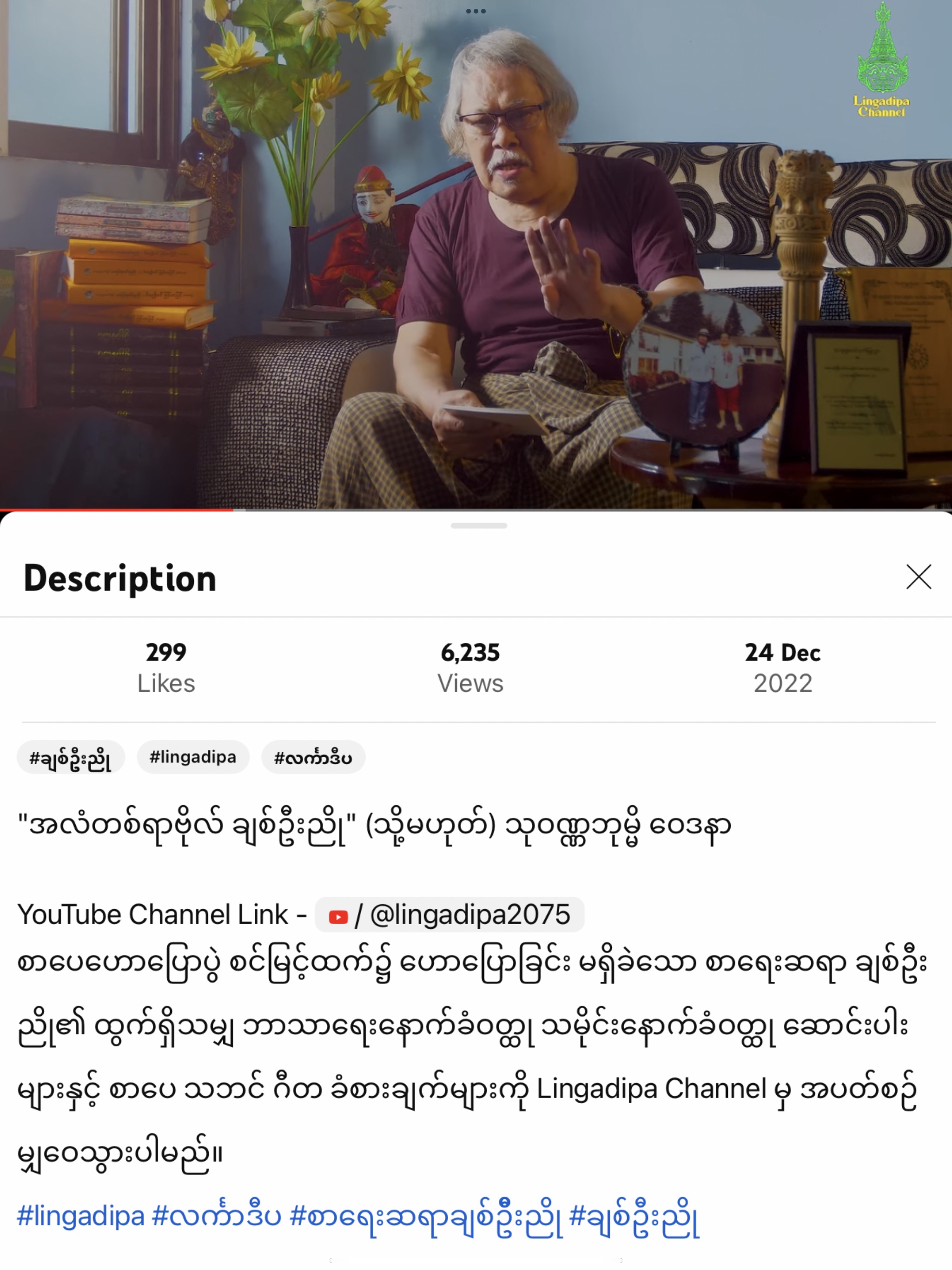 23 Aug 202312 Jul 2024 uamyint ချစ်ဦးညို လ င်္ကာ ဒီပ စာရေး ဆရာ၏ စာပေ သဘင် ဂီတ အနုပညာ ရသ ခံစားချက်များ ဆွေးနွေးပြောကြားချက်များ။ Lingadipa Xhannel ၁ ။ အလံ တရာဗိုလ် ချစ်ကီးညို ‘( သို့မဟုတ် ) သုဝဏ္ဏ ဘုမ္မိ ဝေဒနာ ။ Click to share on Facebook (Opens in new window) Facebook Click to share on X (Opens in new window) X Click to share on LinkedIn (Opens in new window) LinkedIn Click to share on Telegram (Opens in new window) Telegram More Click to share on Tumblr (Opens in new window) Tumblr Like Loading... Related