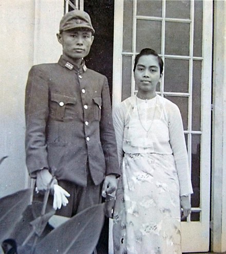 Aung San in Burma Defence Army uniform with Daw Khin Kyi after their marriage in 1942