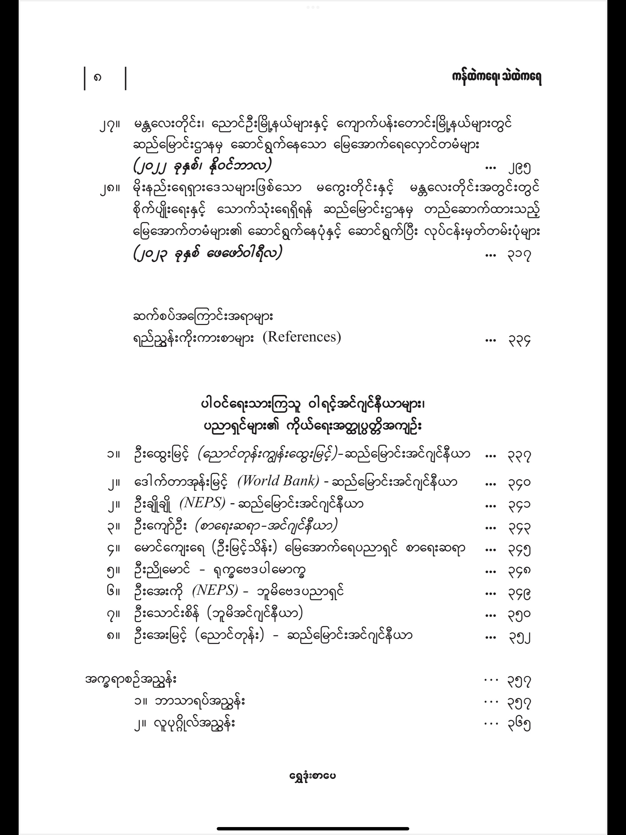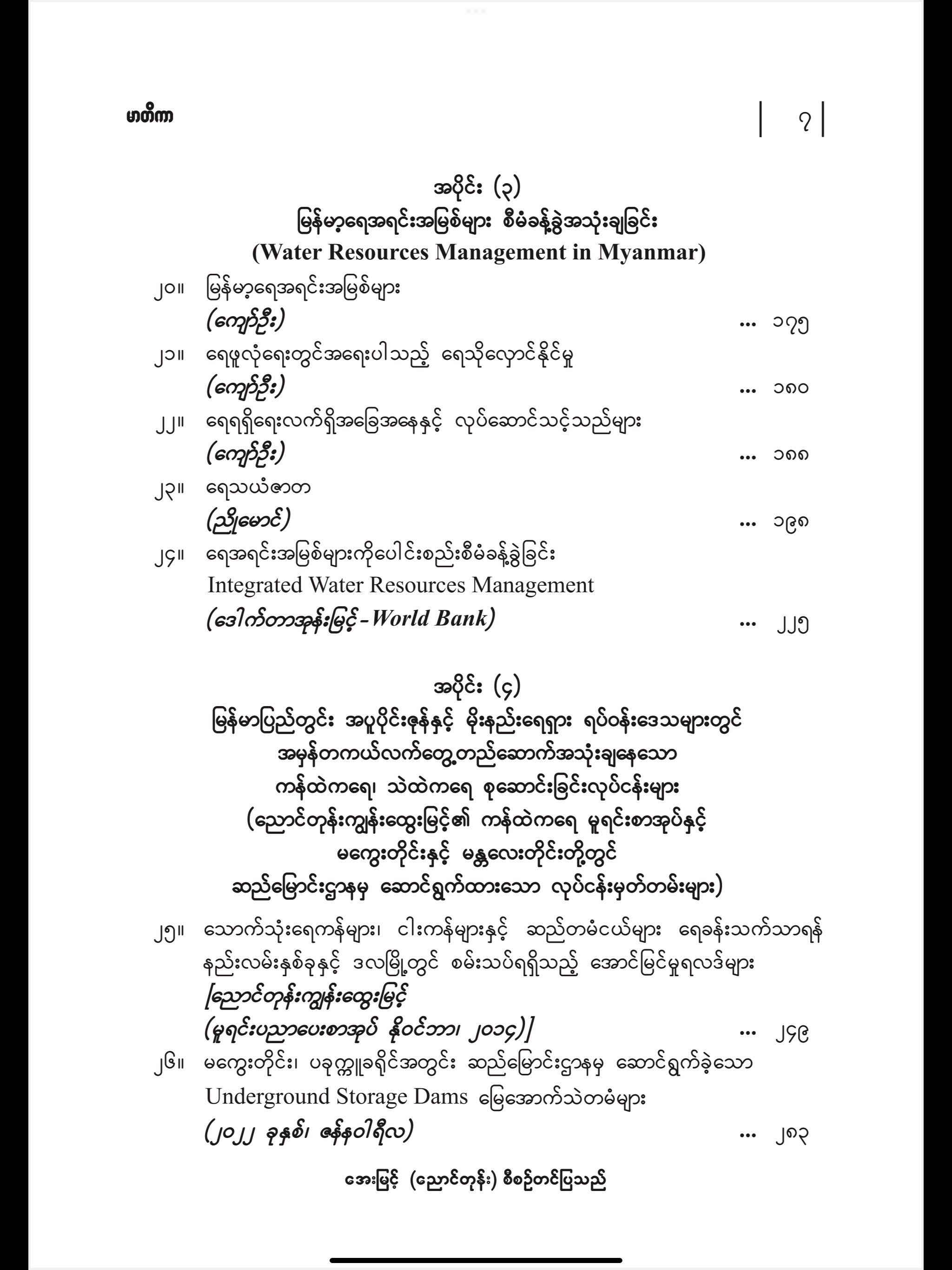 မြန်မာနိုင်ငံ၏ ရေအရင်းအမြစ်ဆိုင်ရာ အချက်အလက်များ ကိန်းဂဏန်းများကို စာအုပ်၏ တတိယအပိုင်းတွင် အားပါးတရ ဖတ်ကြ ကိုးကားကြရမည်။ စတုတ္ထအပိုင်းတွင် ရန်ကုန်တိုင်း ဒလတွင် သောက်ရေကန်ထဲမှ ရေများ အငွေ့ပြန်မှု လျော့နည်းစေရန် လုပ်ဆောင်ချက် အဆင့်ဆင့် အပြင် အညာ မိုးနည်းရေရှား ကျေးရွာများ၏ သဲချောင်းများ၌ ဆည်မြောင်းဌာနက တည်ဆောက်ခဲ့သော မြေအောက်သဲတမံများ၏ ပုံစံနှင့် မြေပုံ ဓာတ်ပုံများ စာရင်းဇယားများကို ဝေဝေဆာဆာ မြင်တွေ့နိုင်ကြသည်။