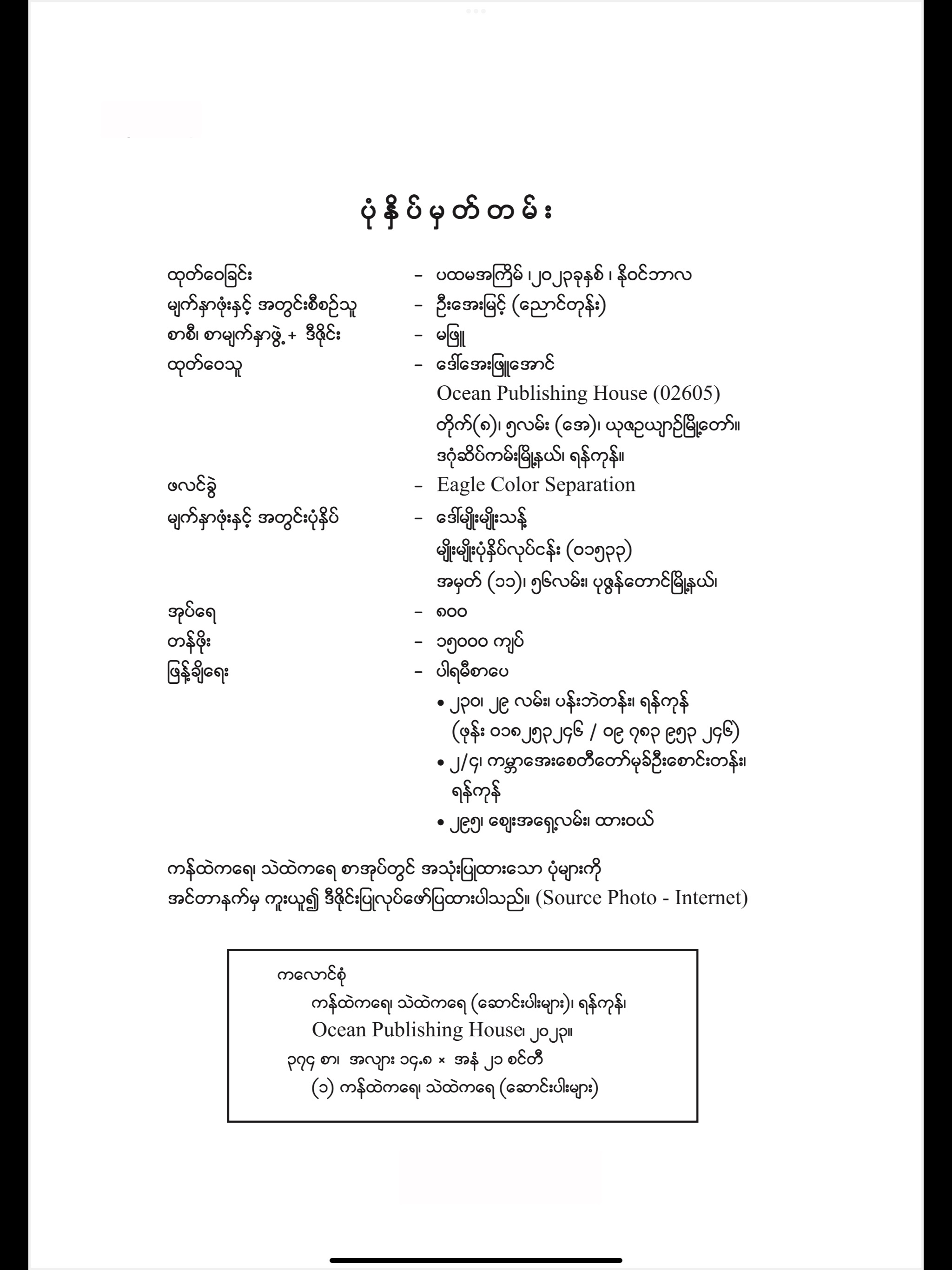 (ဤစာအုပ်ကို အလိုရှိသူများ ပါရမီစာပေ၊ ၂၃၀၊ ၂၉ လမ်း၊ ပန်းဘဲတန်း၊ ရန်ကုန်(ဖုန်း ဝ၁ ၈၂၅၃၂၄၆ / ဝ၉ ၇၈၃ ၉၅၃ ၂၄၆)။ ၂/၄၊ ကမ္ဘာအေးစေတီတော်မုခ်ဦးစောင်းတန်း (ဖုန်း ဝ၉ ၂၆၂ ၂၆၄ ၇၀၈)။ ၂၉၅၊ ဈေးအရှေ့လမ်း၊ ထားဝယ် (ဖုန်း ဝ၅၉၂၀၂၃၀၃၅)တို့၌ ရောင်းဈေး ၁၅၀ဝ၀ ကျပ်ဖြင့် ဝယ်ယူနိုင်ပါသည်။
