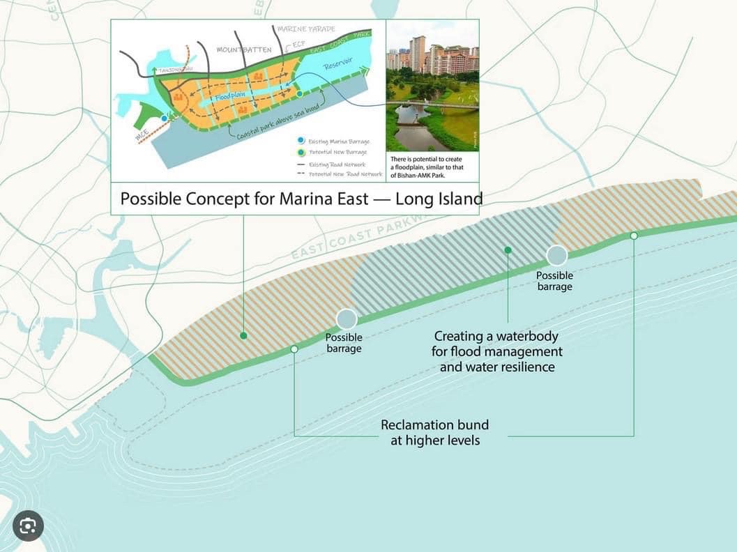 ကျနော်ကျမတို့အပတ်စဉ်သွားနေကျ သဘာဝ East Coast သဲသောင်ပြင်ကြီးကို ပင်လယ်လှိုင်းလာမပုတ်တော့ဘူးပေါ့အဲ့ဒီသဲသောင်ပြင်ကြီးရဲ့ ၁၀၀% ဟာ သဘာဝကမ်းခြေမဟုတ်ဘူးလို့ ဆိုပါတယ်။ ဒီနေရာတွေဟာ ၁၉၆၆ ခုနှစ်မှာစခဲ့တဲ့ East Coast Reclamation Scheme ထဲမှာပါခဲ့တာပါ။(ပုံထဲမှာကြည့်ရင် စင်ကာပူရဲ့အရင်က မြေဖို့ပြီးကုန်းမြေလုပ်ထားတဲ့နေရာတွေနဲ့ နောင်အနာဂတ်မှာ မြေဖို့နိုင်တဲ့ နေရာတွေကို တွေ့နိုင်ပါတယ်)အဲ့ဒီလိုဖြည့်ဖို့မြေတွေကို Bedok နဲ့ Tampines တောင်ကုန်းတွေကမြေတွေနဲ့ ပြည်ပကတင်သွင်းတဲ့ သဲတွေပါဝင်ပါတယ်။အခု Long Island ပေါ်လာရင် မြို့လည်ခေါင်က Marina East ဒိစတြိတ်အနေနဲ့ Long Island နဲ့ဆက်သွားပြီး Marina downtown central business ဒိစတြိတ်ပေါ်လာနိုင်ပါတယ်။ချန်ဂီလေဆိပ်ဖက်မှာလည်း ချန်ဂီလေဆိပ်က Changi Business Park ကို logistics နဲ့ aviation hub အဖြစ်တိုးချဲ့နေမှုကို အထောက်အကူပြုပါလိမ့်မယ်။