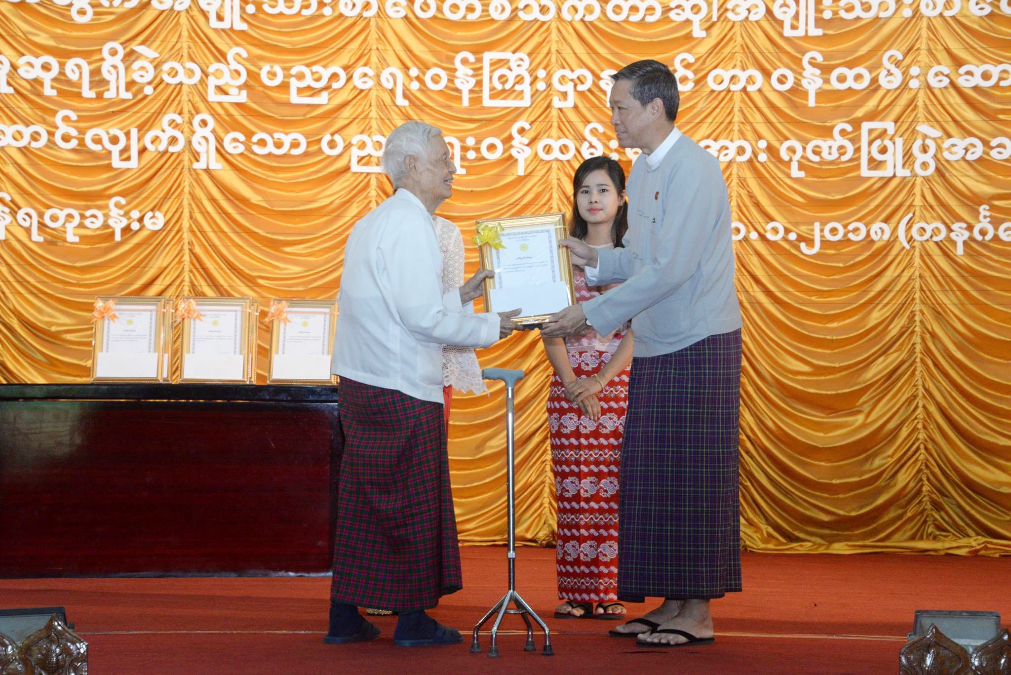 ပညာရေးဝန်ကြီးဌာနတွင်ထမ်းဆောင်ခဲ့သော ဒေါက်တာခင်မောင်ညွန့်အား ပညာရေးဝန်ကြီးဌာန ပြည်ထောင်စုဝန်ကြီးက ဂါရဝလက်ဆောင်ကန်တော့စဉ် (၂၀၁၈ခုနှစ်)