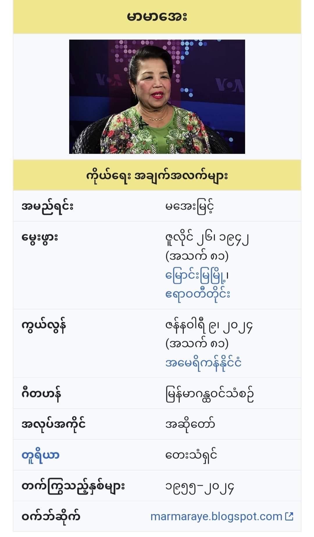 မနေ့က ဒေါ်မာမာအေး ဆုံးသွားတာနဲ့တပြိုင်နက် လူမှုကွန်ရက်မှာရော တခြားမီဒီယာတွေမှာပါ သူ့ နာရေးသတင်းတွေ တပြိုင်နက် တက်လာလိုက်ကြတာ တကမ္ဘာလုံးက မြန်မာလူမှုကွန်ရက်မှာ ဝက်ဝက်ကွဲအောင် လှုပ်သွားတာပဲ ။ ပြည်သူချစ်တဲ့မာမာအေး ဆိုတာ သူများက နာမည်ပေးစရာမလိုအောင် သက်သေပြသွားတာပါ ။
