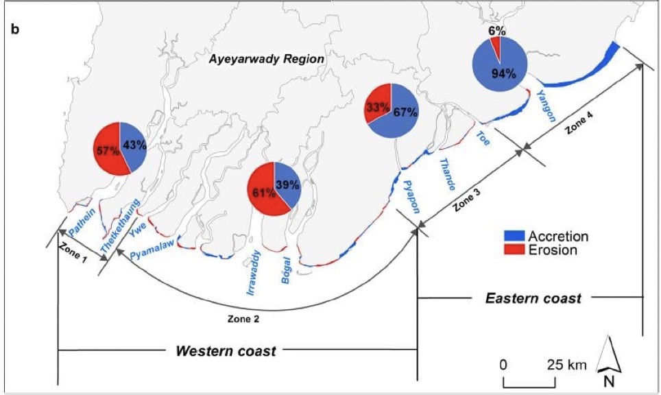 ၄၄နှစ် အတွင်း ဧရာဝတီမြစ်ဝကျွန်းေပါ် ကမ်းရိုးတန်း ရဲ့ အနောက်ဘက်ခြမ်း (ပုသိမ်၊ လပွတ်တာ) ဟာ တိုက်စားမှု erosion ပိုများလာပြီး (တစ်နှစ် ၁၀မီတာနှုန်း) မြစ်ဝ ကျွန်းေပါ် အေရှ့ပိုင်း (ဒလ၊ ရန်ကုန်) ဖက် မှာေတာ့ နှုံးတာ ပြင် များ mudflats ပင်လယ်ဘက်တိုးလာပါတယ်၊