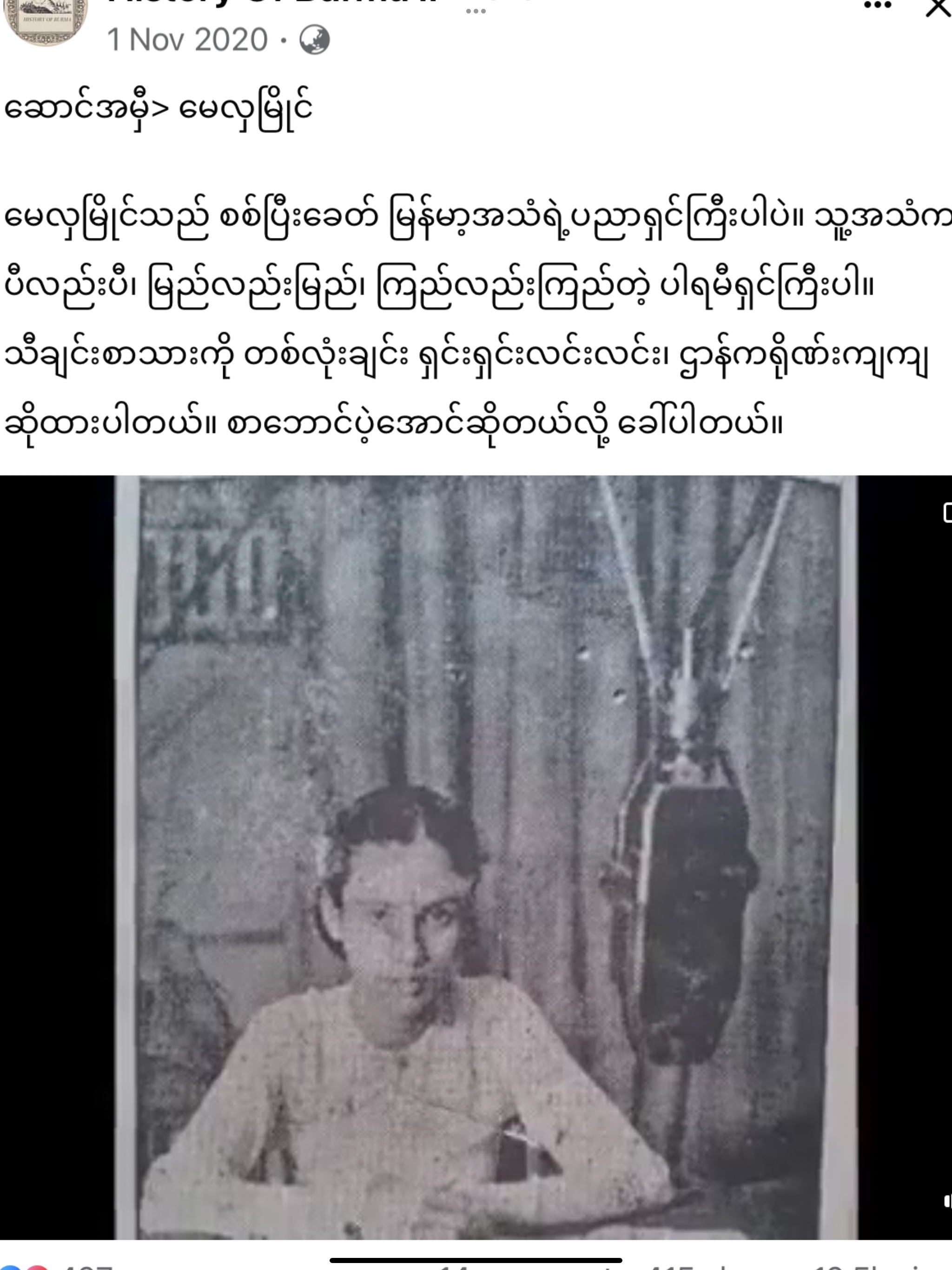 မေလှမြိုင် ကတော့ စစ်ပြီးခေတ် မြန်မာ့အသံ မှာ ထိပ်ထိပ်ကြဲပညာရှင်ကြီးပါပဲ။ သူ့အသံက ပီလည်းပီ၊ မြည်လည်းမြည်၊ ကြည်လည်းကြည်တဲ့ ပါရမီရှင်ကြီးပါ။ သီချင်းစာသားကို တစ်လုံးချင်း ရှင်းရှင်းလင်းလင်း၊ ဌာန်ကရိုဏ်းကျကျ ဆိုထားပါတယ်။ စာဘောင်ပဲ့အောင်ဆိုတယ်လို့ ခေါ်ပါတယ်။ ဒါတောင်မှ နှစ်တွေကြာလာတဲ့အခါ စာသားတွေကို နားကြားနဲ့ ထင်သလိုပြင်ဆိုကြရင်း “မြိုင်ဆိုရင် ဆိုင်သလို စကားနော် မြိုင်အပိုမကြွားဘူး တရားနဲ့ပျော်တဲ့ မြိုင်..မမြိုင်၊ မမြိုင်..” ကို တချို့ကဆိုကြရာမှာ ”မြိုင်ဆိုရင် စိုင် ဂဠုန် နဂါးရော မြိုင်ဗိုလ်မထားဘူး အများကတင်တဲ့မြိုင်..” လို့ ဆိုကြတာ တော်တော်ကြားမိပါတယ်။ အဓိပ္ပာယ်တခြားစီပါ။
