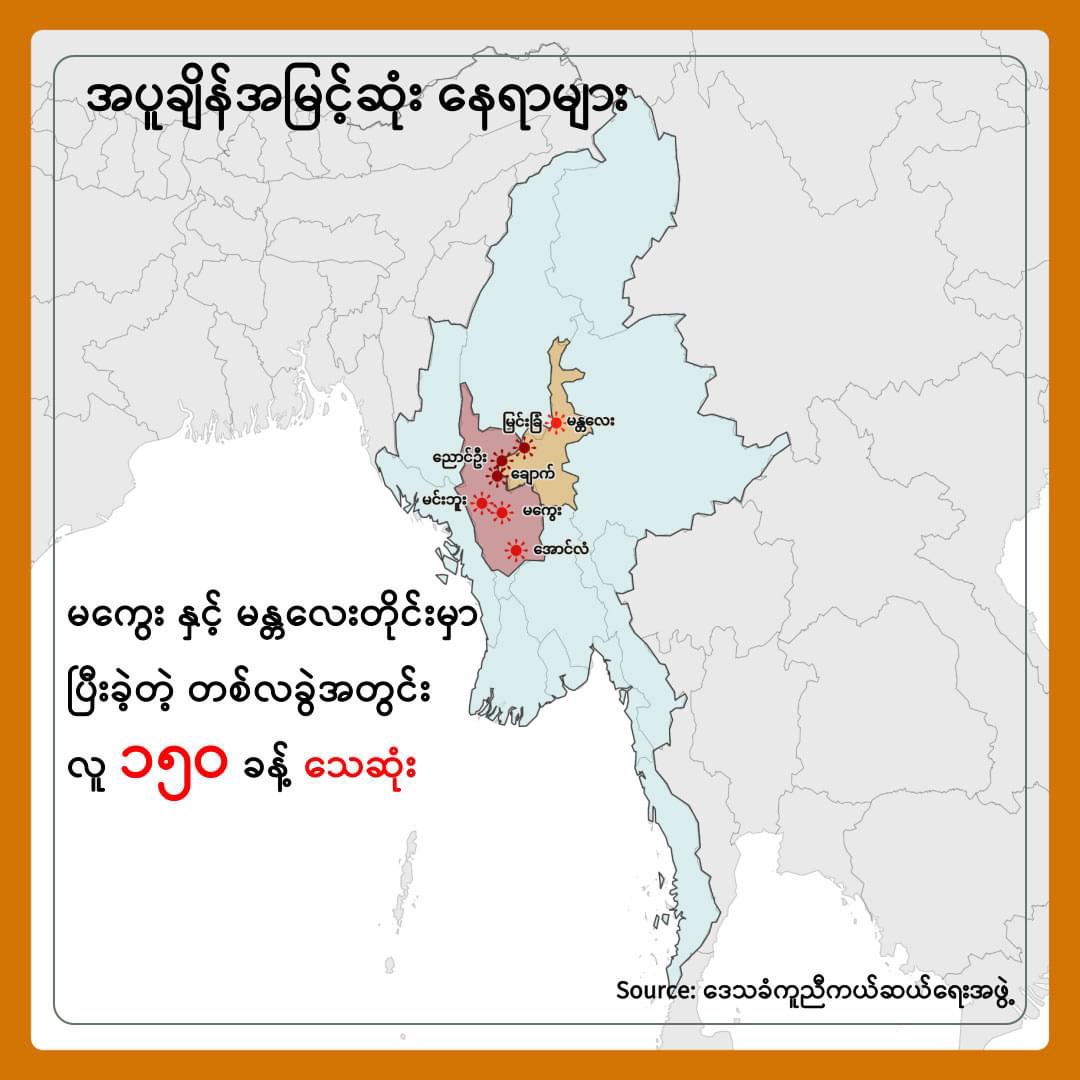 မကွေးတိုင်း၊ ချောက်မြို့ဟာ ကမ္ဘာပေါ်မှာ အပူဆုံးမြို့ စာရင်းဝင်နေပါတယ်။ ၄၈.၂ ဒီဂရီဆဲလ်စီးယပ် ( ၁၁၈ ဒီဂရီဖာရင်ဟိုက်) အပူချိန်ရှိပါတယ်။ အယ်လ်နီညို အပူလှိုင်းကြောင့် ဒေသတချို့မှာ လူသေဆုံးတာတွေရှိနေပြီး ပြီးခဲ့တဲ့ တစ်ရက်ကျော်အတွင်း မန္တလေးနဲ့ မကွေးတိုင်းမှာ လူအယောက် ၁၅ဝ လောက်သေဆုံးခဲ့တယ်လို့ ဒေသခံအကူအညီပေးရေးအဖွဲ့တွေကပြောပါတယ်။ RFA BURMESE 29 April2024