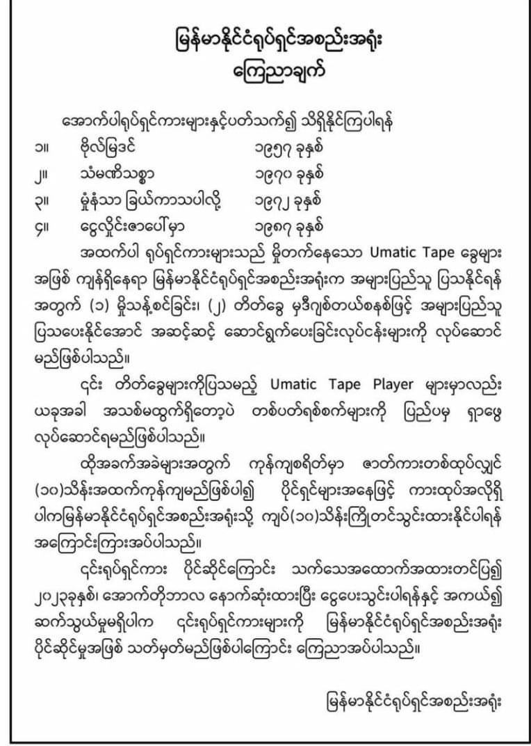 ၁၉၈၇ခုနှစ်မှာထွက်ခဲ့တဲ့ ဦးဦးပါဝင်သရုပ်ဆောင်ညွှန်ကြားရိုက်ကူးပြီး ဝင်းဦး၊ကျော်စွာဝင်း၊ချိုပြုံး၊အေးအေးသင်းတို့ ပါဝင်ထားတဲ့ ငွေလှိုင်းဇာပေါ်မှာရုပ်ရှင်အပါအဝင်ရုပ်ရှင်ဇာတ်ကား ၄ ကားကို ဖလင်ကနေ digital ပြောင်းပြီးအများပြည်သူတွေကိုပြသဖို့စီစဉ်နေကြောင်း ရုပ်ရှင်အစည်းအရုံးက နေ ပြီးခဲ့တဲ့ ၂၀၂၃ ခုနှစ် ၇လပိုင်း၊လွန်ခဲ့တဲ့ ၁၀လလောက်ကကြော်ငြာထားတာကို သတင်း website တစ်ခုမှာဖတ်လိုက်ရပါတယ်။မှိုတက်နေတဲ့ ဖလင်တွေကို မှိုသန့်စင်ဖို့ အတွက် နဲ့ digital ပြောင်းဖို့က ကားထုပ်တစ်ထုပ်ကိုငွေကျပ် ၁၀သိန်းကျော်ခန့်ကုန်ကျမှာဖြစ်ပြီး ဇာတ်ကားထုပ်တွေရဲ့မူလပိုင်ရှင်တွေအနေနဲ့ ကားထုပ်ပိုင်ဆိုင်ကြောင်းအထောက်အထားနဲ့အတူ ကျသင့်ငွေကို ရုပ်ရှင်အစည်းအရုံးကိုပေးသွင်းရမှာဖြစ်ပြီးတကယ်လို့ပေးသွင်းခြင်းမရှိပါက အစည်းအရုံးက ကျသင့်ငွေကိုစိုက်ထုတ် ပြောင်းလဲကာ အစည်းအရုံးရဲ့ မူပိုင်အဖြစ်သိမ်းဆည်းသွားမယ်လို့ သတင်းမှာဖော်ပြထားပါတယ်