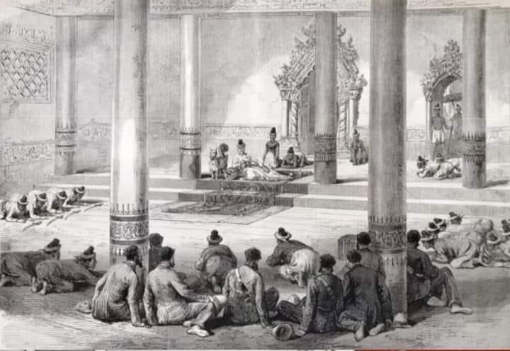 ယခု ထည့်သွင်းထားသော ပန်းချီပုံမှာ မင်းတုန်းဘုရင် ၏ နံနက်ညီလာသို့ ခစားရောက်ရှိလာကြသော နိုင်ငံခြားသားများကို ဖိနပ်ဗလာ ဦးထုပ်ကင်းမဲ့စွာနှင့် ဘုရင်ကြီး ၏ ရှေ့တူရှုရှိ ဝန်ကြီး၊မှုးမတ်တို့၏ အလယ်တွင် တွေ့ရသည့်ပုံရိပ်ဖြစ်သည်။