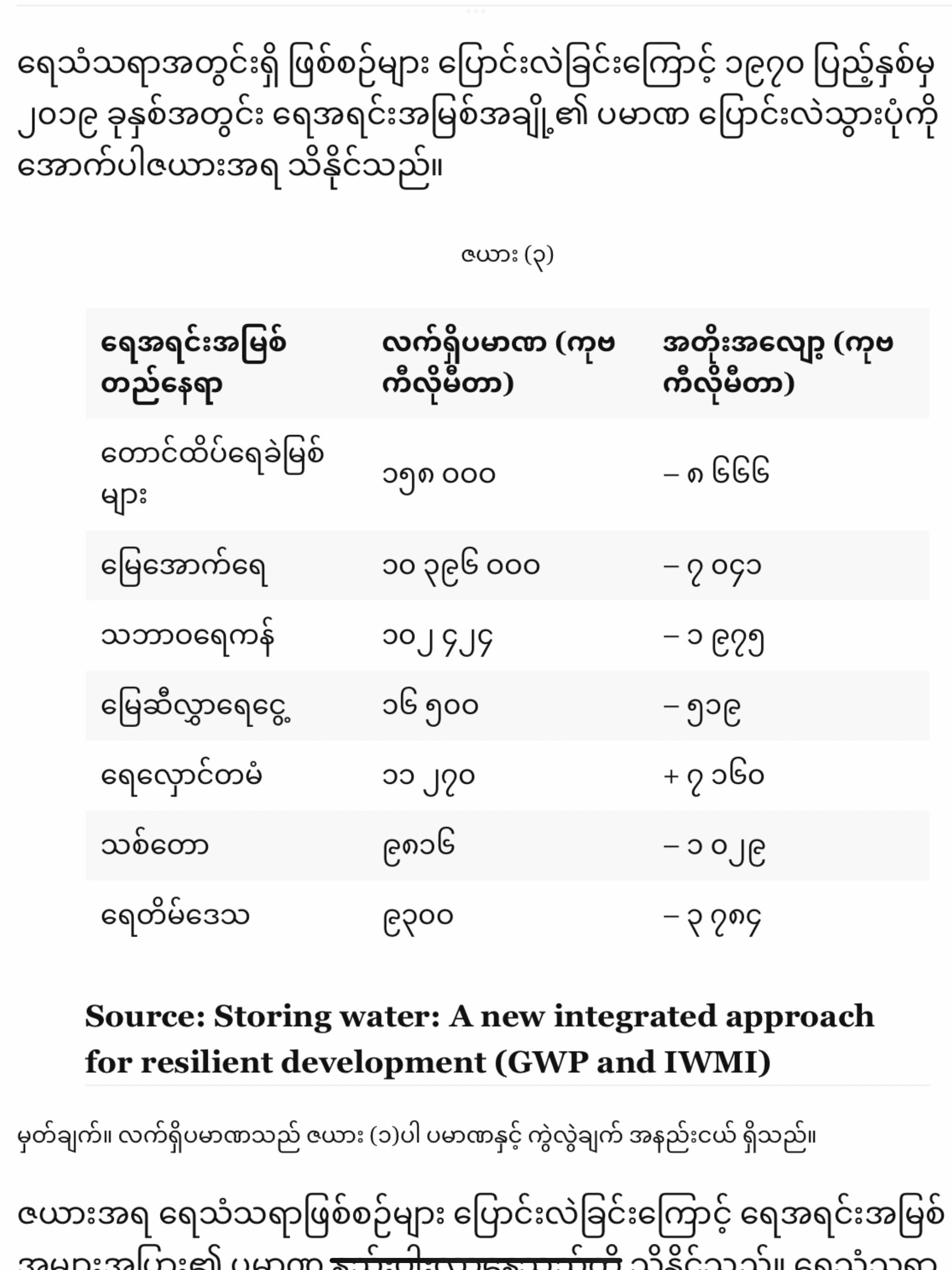 သောက်သုံးရေအတွက် တဆင့်ခံအကျိုးပြုသည့်အပြင် သဘာဝပတ်ဝန်းကျင် ဂေဟစနစ်များအတွက် မရှိမဖြစ်သည့် မြေဆီလွှာရေငွေ့များ၊ သစ်တောနှင့် ရေတိမ်ဒေသများတွင် ရေလျော့နည်းလာခြင်းသည် စိုးရိမ်ဖွယ်အခြေအနေသို့ ရောက်နေ သည်။ ဇယား (၃)အရ သစ်တောများ၌ ရေပါဝင်မှုသည် လက်ရှိပမာဏ၏ ၁၀ ရာခိုင်နှုန်းခန့်၊ ရေတိမ်ဒေသများ၌ ရေပါဝင်မှုသည် လက်ရှိပမာဏ၏ ၄၀ ရာခိုင်နှုန်းခန့်အထိ လျော့နည်းလာခဲ့သဖြင့် ယင်းတို့ကို ထိန်းသိမ်းခြင်းကို အလေးအနက်ထား ဦးစားပေးရန် လိုအပ်သည်။