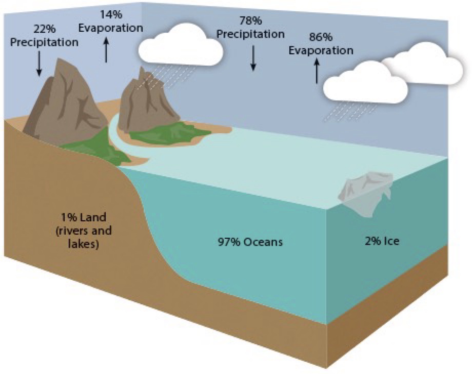 ရေသံသရာလည်ခြင်း ဟူသော သဘာဝဖြစ်စဉ်က ကမ္ဘာပေါ်ရှိ ရေအားလုံးကို တစ်နေရာမှ တစ်နေရာသို့ ကူးပြောင်း လှည့်ပတ်ပေးနေသည်။ ပင်လယ်သမုဒ္ဒရာရေများ အငွေ့ပြန်ကာ လေထုထဲ ရောက်သည်။ လေထုထဲမှရေငွေ့များ ဆီးနှင်းနှင့်မိုးအဖြစ် ရွာကျရာတွင် အများစုသည် ပင်လယ် သမုဒ္ဒရာထဲ ပြန်ရွာကျ၍ ရေငန်ပြန်ဖြစ်သည်။ မြေပြင်ပေါ် ရွာကျသည့် ဆီးနှင်းနှင့်မိုးရေများသည် ရေခဲပြင်၊ မြေပေါ်ရေကန်နှင့်မြစ်ချောင်းများ၊ မြေအောက်ရေများဖြစ်ကာ နောက်ဆုံးတွင် ပင်လယ် သမုဒ္ဒရာထဲပြန်ရောက်သည်။ ကမ္ဘာပေါ်ရှိ ရေများအားလုံး ရေထု လေထု မြေထုများအကြား တစ်ပတ်လည်ရန် နှစ်ပေါင်း ၁၂၅၀ဝ ခန့်ကြာသည်။