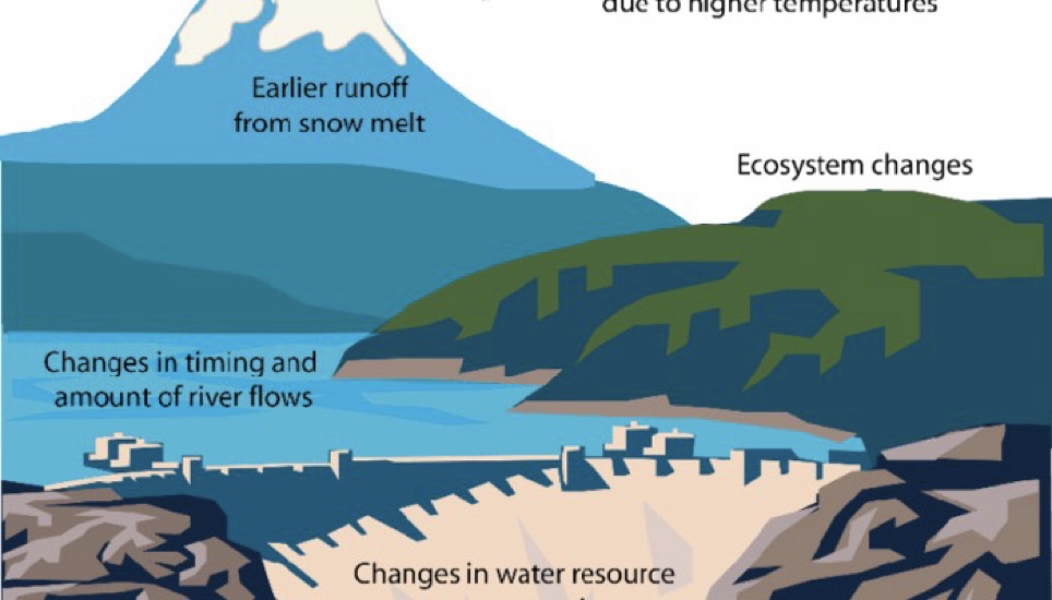 ယခုအခါ ရာသီဥတုပြောင်းလဲခြင်းကြောင့် နွေအခါ ရေခဲအရည်ပျော်မှု ပိုလာပြီး ဆောင်းအခါ ရေခဲပြန်ဖြစ်မှု နည်းလာသည်။ ယင်းနည်းဖြင့် တောင်ထိပ်ရေခဲများ တတိတိ လျော့နည်းလာနေရာ ရေခဲပျော်ရည်များကို လက်ခံရရှိနေသော မြစ်များ၏ရေစီးသည် အနှေးနှင့်အမြန် နည်းလာမည် ဖြစ်သည်။