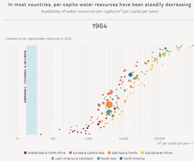 အပေါ်ဆုံးပုံအရ ၁၉၆၄ ခုနှစ်က လူတစ်ဦးအတွက် ထုတ်ယူနိုင်သော ရေအရင်းအမြစ်ပမာဏ ကုဗမီတာ ၁၀ဝဝဝ၀ အထက်ရှိသည့်နိုင်ငံ အသင့်အတင့်များကြောင်း တွေ့ရမည်။ ယင်းနှစ်က နိုင်ငံအများစုသည် သောက်သုံးရန် စသည်အပြင် စိုက်ပျိုးမွေးမြူရေးအတွက်ပါ အနိမ့်ဆုံးလိုအပ်ချက် ဖြစ်သည့် ရေကုဗမီတာ ၂၀ဝ၀ နှင့် အထက် ပိုင်ဆိုင်ကြသည်။ စိုက်ပျိုးမွေးမြူရေးအတွက် ရေမလုံလောက်သော နိုင်ငံအနည်းငယ် ရှိပြီး သောက်သုံးရန်စသည်တို့အတွက် မလုံလောက်သောနိုင်ငံဟူ၍ မတွေ့ရချေ။