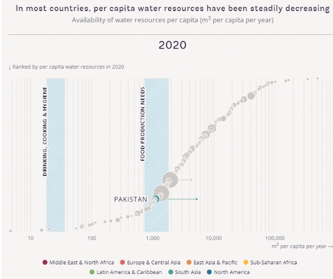 အောက်ဆုံးပုံအရ ၂၀၂၀ ပြည့်နှစ်တွင် နိုင်ငံအများစု၌ ထုတ်ယူသုံးစွဲနိုင်သော ရေအရင်းအမြစ်ပမာဏ ပိုနည်းလာသည်။ ဥပမာ – ပါကစ္စတန်နိုင်ငံရှိ ထုတ်ယူနိုင်သောရေပမာဏသည် ၁၉၆၄ ခုနှစ်ကနှင့်စာလျှင် ၈၀ ရာခိုင်နှုန်း လျော့နည်းသွားသည်။ စိုက်ပျိုးမွေးမြူရေးအတွက် ရေမလုံလောက်သော နိုင်ငံနှင့် သောက်သုံးရန် စသည်တို့အတွက် မလုံလောက်သောနိုင်ငံ ပိုများလာသည်။ တစ်ကမ္ဘာလုံးပျမ်းမျှဆိုလျှင် ရေချိုအရင်းအမြစ် နှစ်စဉ်ထုတ်ယူမှု အနည်းငယ်လျော့နည်းလာသော်လည်း နိုင်ငံအများအပြားတွင် ထုတ်ယူမှု တိုးမြင့်လာနေသည်။
