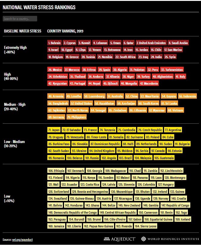 ကမ္ဘာ့အရင်းအမြစ်အဖွဲ့အစည်း (World Resources Institute) က အပေါ်ပုံပါ ထုတ်ပြန်ချက်အရ ကမ္ဘာ့လူဦးရေ စုစုပေါင်း၏ လေးပုံတစ်ပုံ နေထိုင်သည့် နိုင်ငံ ၂၅ နိုင်ငံတွင် တစ်နှစ်အတွင်း ရေသုံးစွဲမှုပမာဏသည် ပြန်ပြည့်နိုင်သည့် ပမာဏ၏ ၈၀ ရာခိုင်နှုန်း အနည်းဆုံး ရှိနေသည်။ ပြန်ပြည့်နိုင်သောရေပမာဏ ငါးပုံလျှင် လေးပုံကို သုံးနေသည့်သဘော ဖြစ်သည်။ အထက်ပါဇယားသည် ၂၀၁၉ ခုနှစ် အခြေအနေကို ဖော်ပြခြင်း ဖြစ်၍ နောက်ပိုင်း၌ ပြောင်းလဲသွားနိုင်သည့်အပြင် ယင်းပြောင်းလဲခြင်းသည် အကောင်းဘက်သို့ မဟုတ်ဘဲ အဆိုးဘက်သို့သာ ဦးတည်နိုင်သည်။