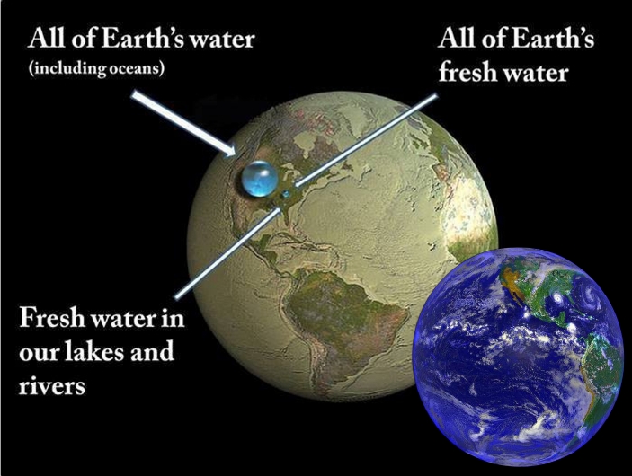 အထက်ပါပုံ၌ ပုံသေးကို ကြည့်လျှင် ကမ္ဘာ့မျက်နှာပြင်ဧရိယာ အတော်များများကို ရေဖုံးနေသဖြင့် ကမ္ဘာကြီးတွင် ရေအလျှံပယ်ကြွယ်ဝသည်ဟု ထင်ရသည်။ တကယ်တွင်လည်း ကမ္ဘာသည် မျက်နှာပြင် ဧရိယာ၏ ၇၁ ရာခိုင်နှုန်း၌ ရေများဖြင့် အတိပြီးနေသည့် ဂြိုဟ်တစ်လုံး ဖြစ်သည်။ သို့သော် ကမ္ဘာပေါ်ရှိ ရေအားလုံးကို ထုတ်ယူစုစည်းကာ ရေစက်တစ်စက်တည်းအသွင်ဖြင့် ကမ္ဘာလုံးပေါ် အချိုးကျ တင်ပြထားသည့် ပုံကြီးကို ကြည့်လျှင် ရေထုထည်စုစုပေါင်းသည် ကမ္ဘာ၏ အရွယ်အစားနှင့် ယှဉ်လျှင် များစွာ သေးငယ်ကြောင်း တွေ့ရသည်။ ရေအလျှံပယ် ကြွယ်ဝသည်ဟု ထင်မြင်ချက်သည် မဟုတ်မှန်ကြောင်း သိလာရသည်။