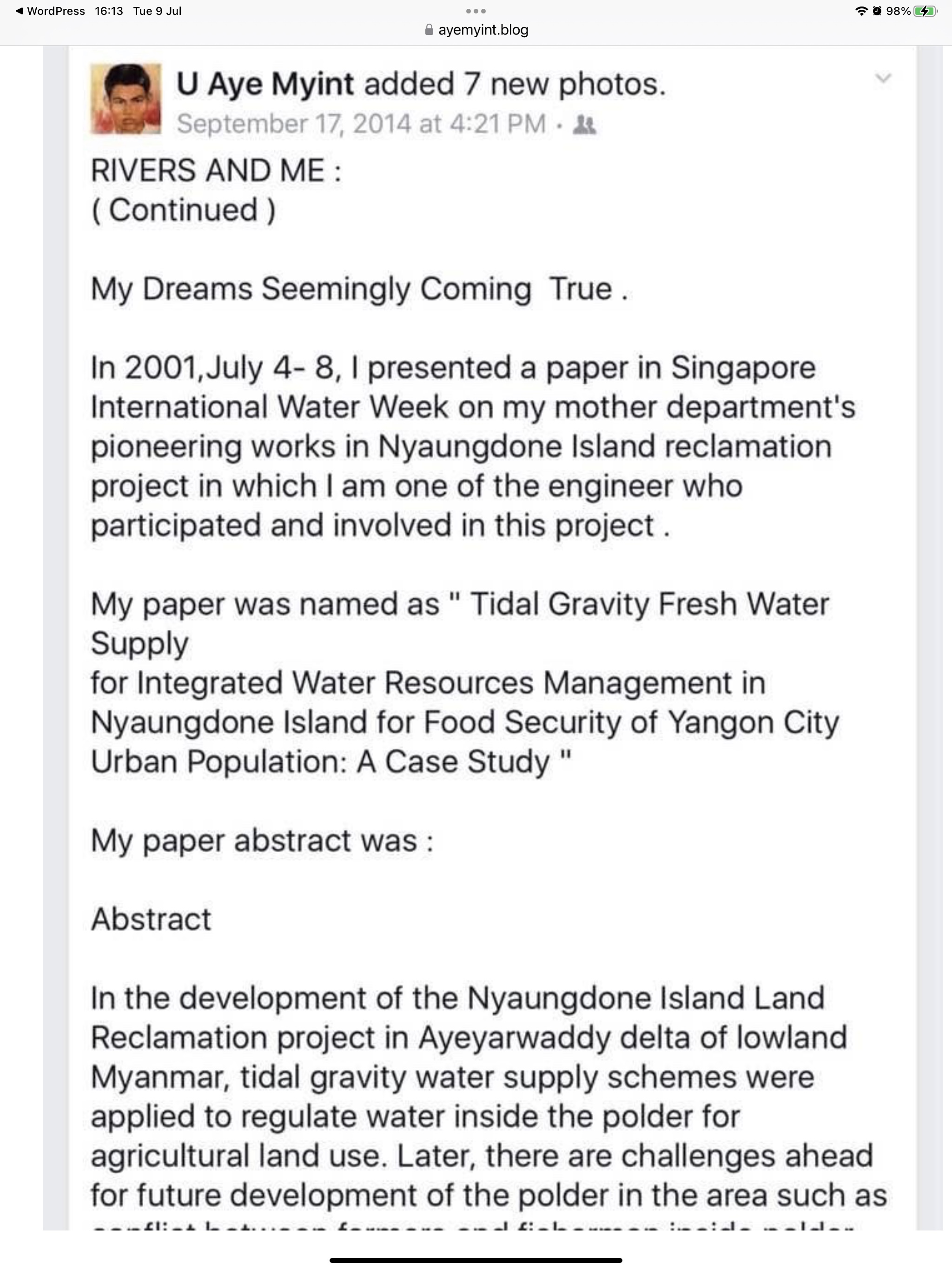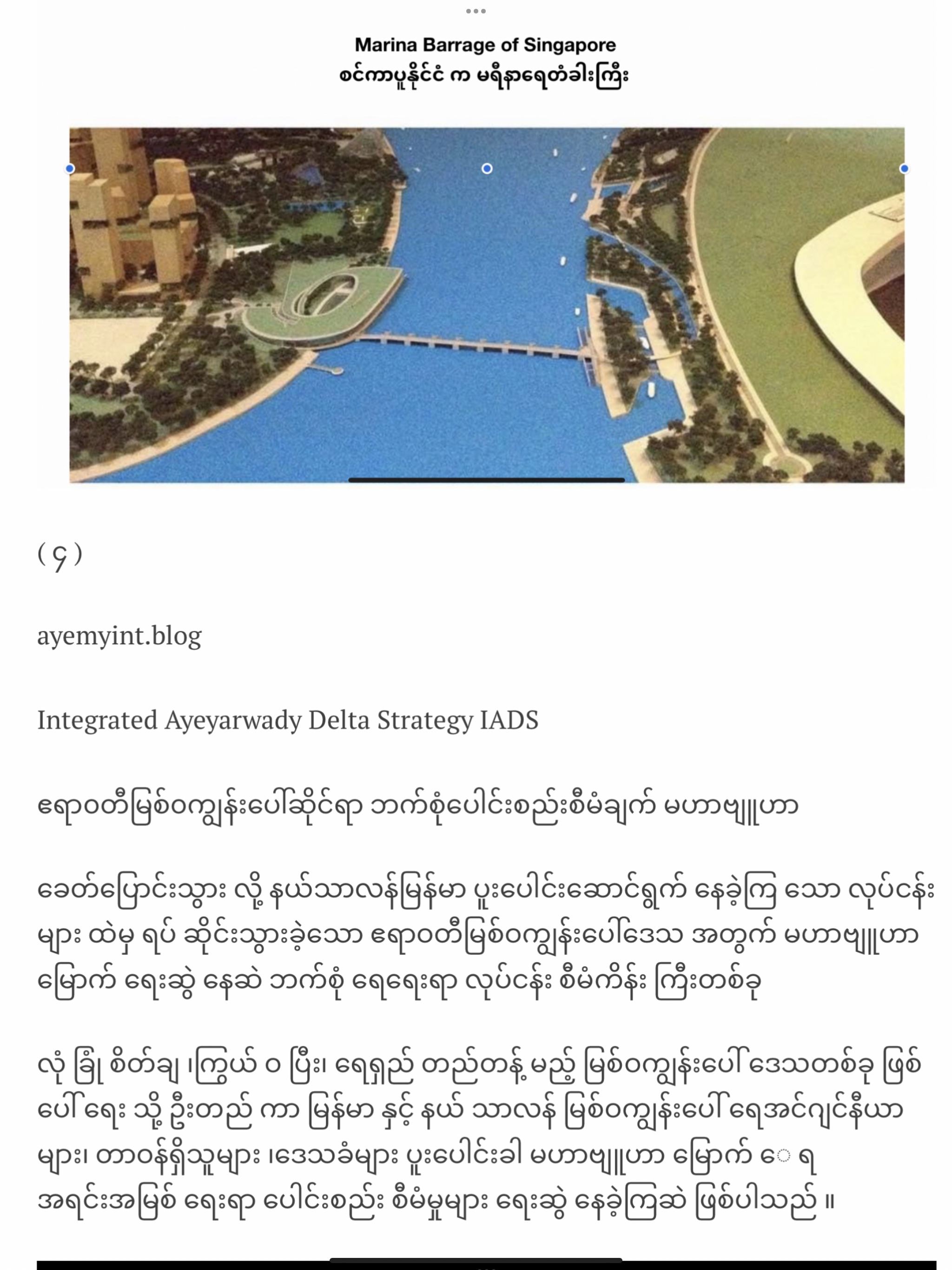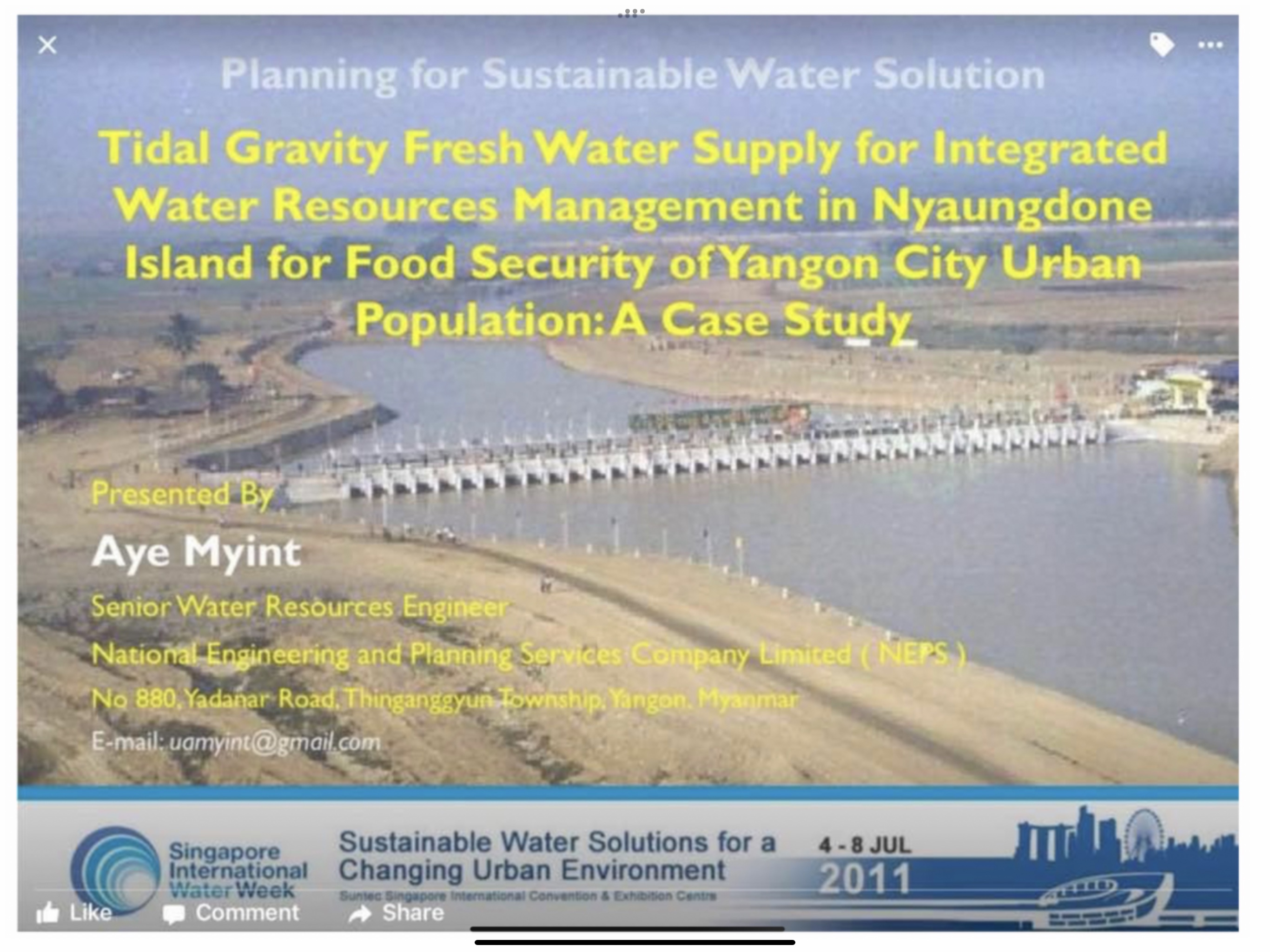 ကျွန် တော်က စင်ကာပူ မရီနာရေတံခါးကြီးနဲ့ပြခန်းကို စတင် ရောက်ခဲ့ပြီး စတွေ့ပြီးကတည်းက ရန်ကုန်တစ်ဖက်ကမိးမှာဆောက်ဘို့အဆင်သင့်ဖြစ်နေတဲ့ ပန်းလှိုင် ဆေးရုံအနီး ပန်းလှိုင် ရေတံခါးကြီးမှာ စင်ကူပူလို ရန်ကုအဣီး ရန်ကုန်မြစ်တစ်ဖက်ကမိးက တည် ဆောက်သင့်တဲ့ နယ်သာလန် က အင်ဂျင်နီယာတွေ ရေတံခါးကြီးပုံစံ ဒီဇိုင်းထုတ်ပေးထားတဲ့ ရေတံခါးကြီးမှာ အပန်းဖြေစရာနေရာဖြစ်စေချင်လို့ စာတစ်တန်ပေတစ်တန်နဲ့ရေးတင် ခဲ့ ဘူးပါတယ်. စင်ကာပူမှာ ပင်လျင် ရေပွဲတော်မှာစာတမ်းတင်ဖတ်ခဲ့ဘူးတယ်,