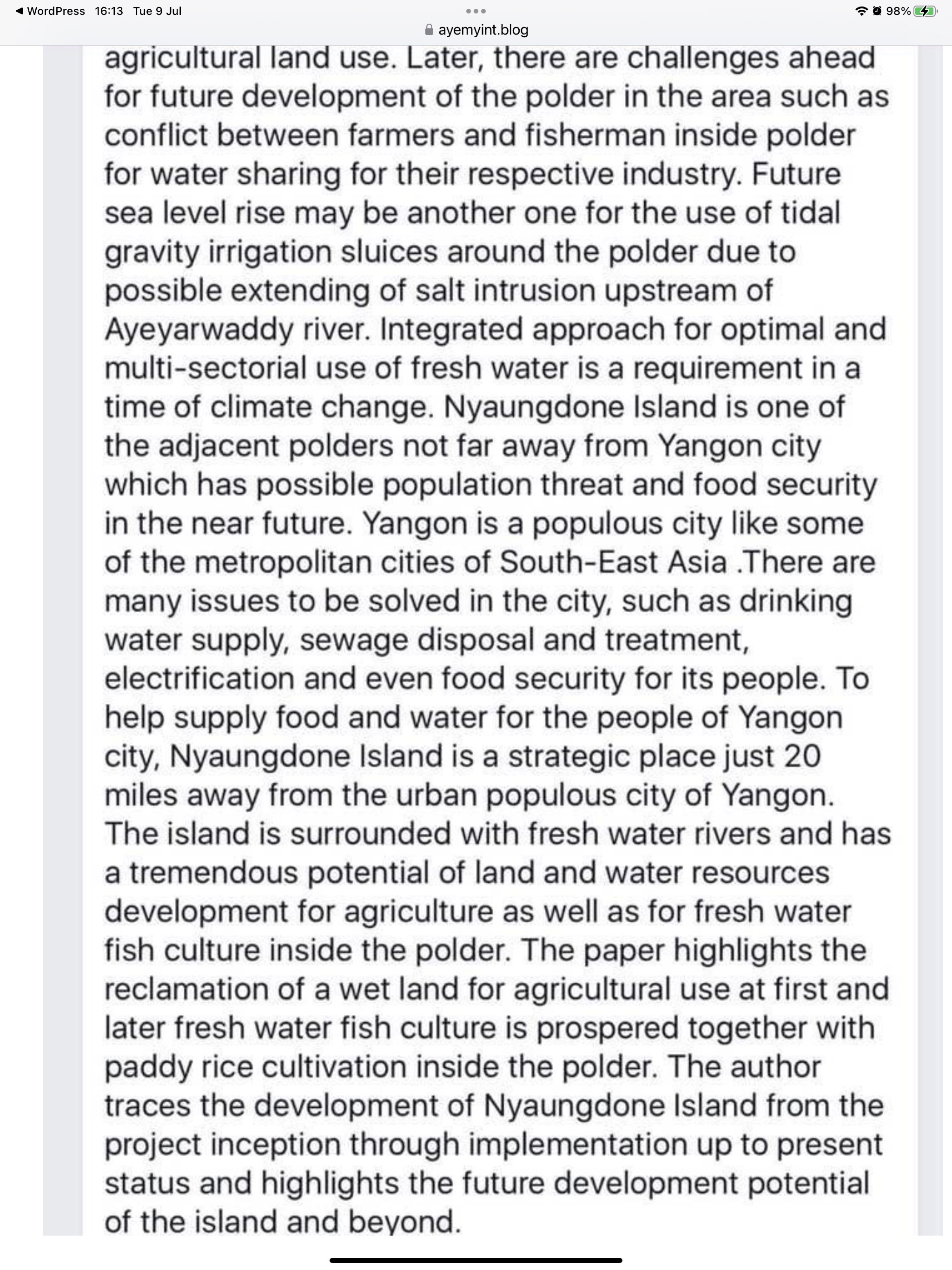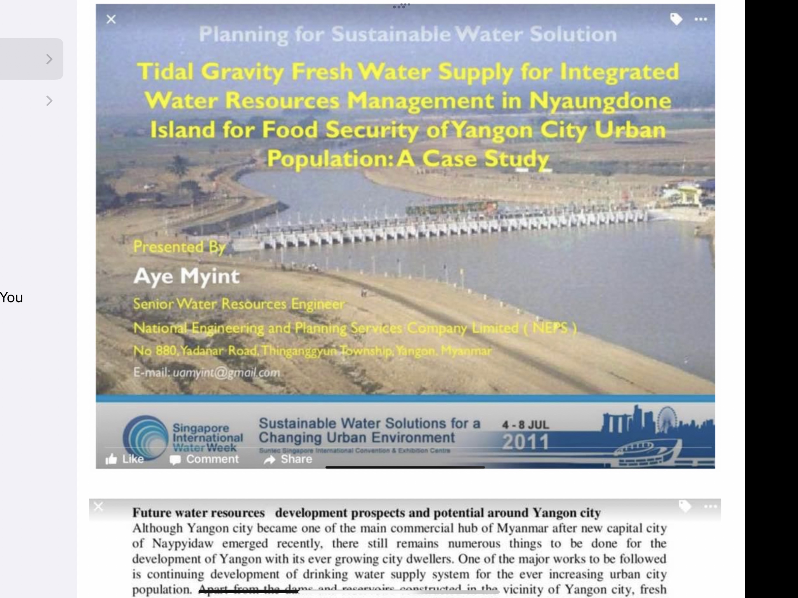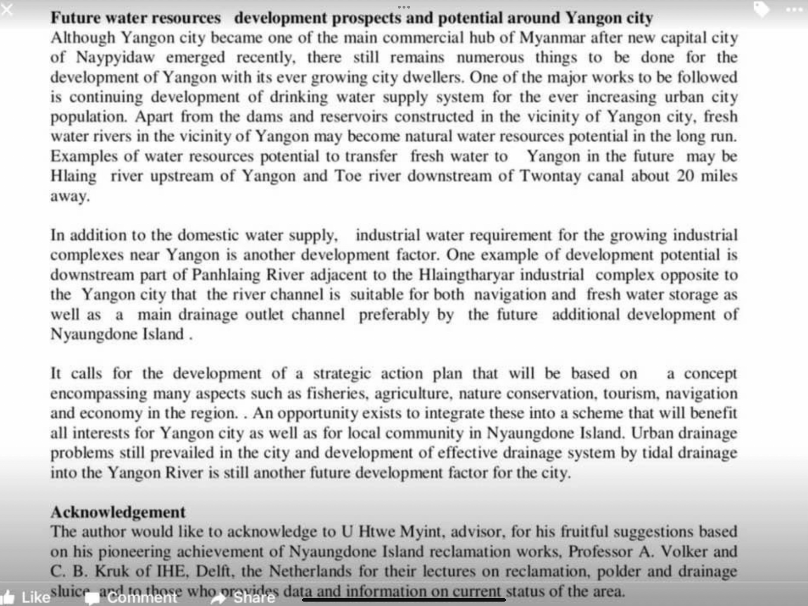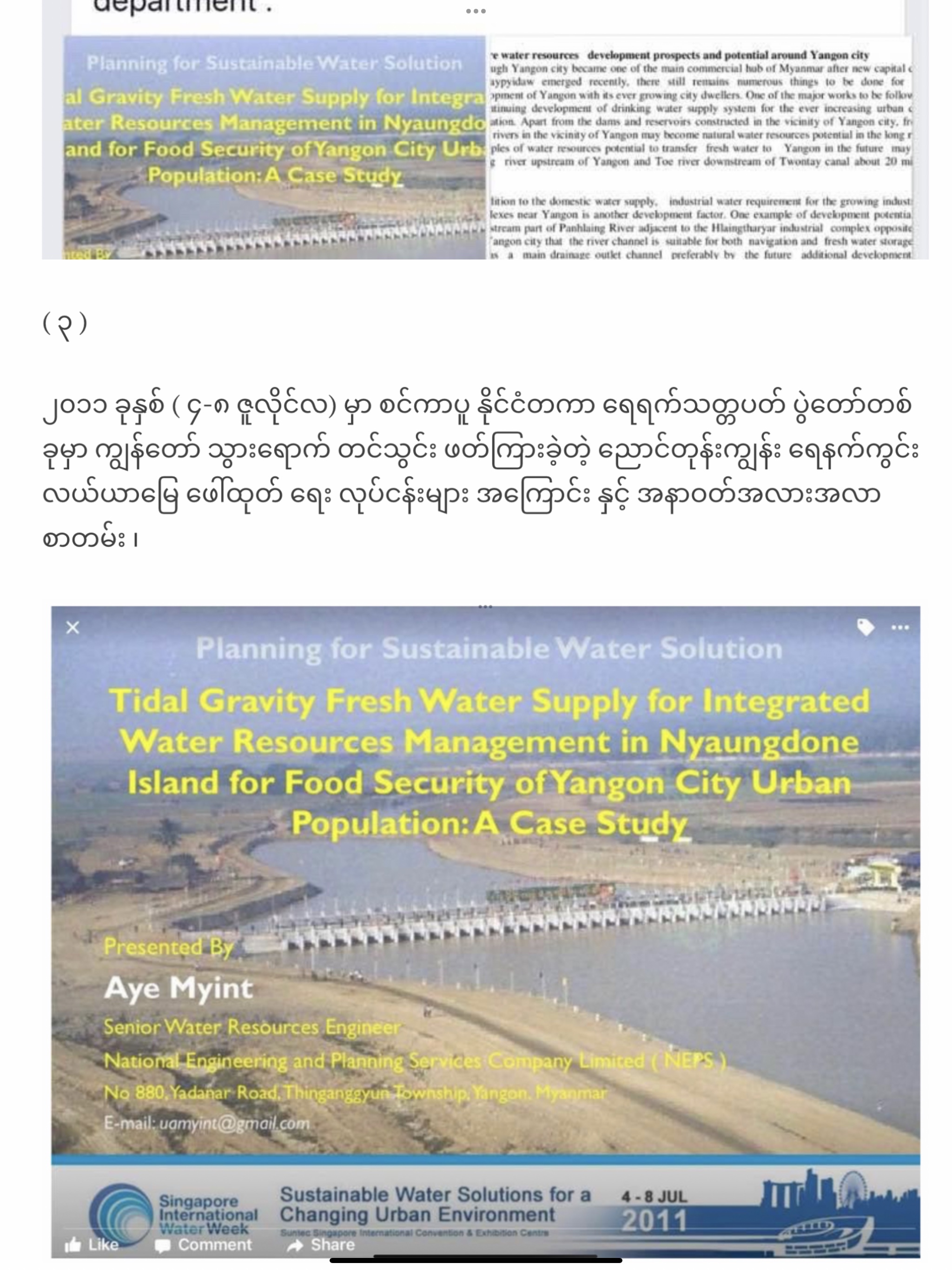 ကျွန် တော်က စင်ကာပူ မရီနာရေတံခါးကြီးနဲ့ပြခန်းကို စတင် ရောက်ခဲ့ပြီး စတွေ့ပြီးကတည်းက ရန်ကုန်တစ်ဖက်ကမိးမှာဆောက်ဘို့အဆင်သင့်ဖြစ်နေတဲ့ ပန်းလှိုင် ဆေးရုံအနီး ပန်းလှိုင် ရေတံခါးကြီးမှာ စင်ကူပူလို ရန်ကုအဣီး ရန်ကုန်မြစ်တစ်ဖက်ကမိးက တည် ဆောက်သင့်တဲ့ နယ်သာလန် က အင်ဂျင်နီယာတွေ ရေတံခါးကြီးပုံစံ ဒီဇိုင်းထုတ်ပေးထားတဲ့ ရေတံခါးကြီးမှာ အပန်းဖြေစရာနေရာဖြစ်စေချင်လို့ စာတစ်တန်ပေတစ်တန်နဲ့ရေးတင် ခဲ့ ဘူးပါတယ်. စင်ကာပူမှာ ပင်လျင် ရေပွဲတော်မှာစာတမ်းတင်ဖတ်ခဲ့ဘူးတယ်,