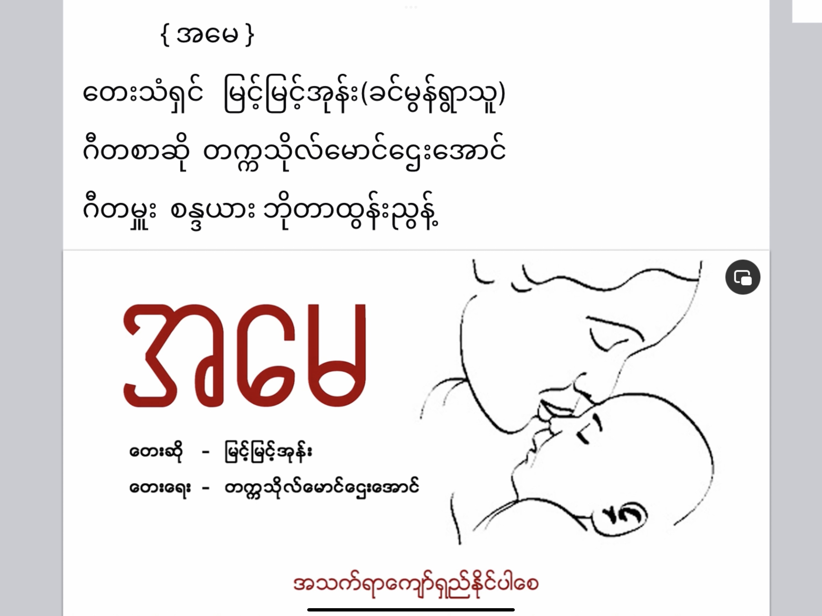 ( ကျေးဇူးများဆပ်မဝဧကံ ကျွေးမွေးမပျက်ဆောင်ရွက်စီမံ မွေခံထိုက်စေ လှူမျှဝေ၍ စောင့်လေမျိုးနွယ် ဝတ်ငါးသွယ်မကျန်စေ နားရေလည်တဲ့သမီးပါမေမေ ဒါကြောင့်သာထာဝစဥ်အမြဲတစေ သမီးငယ်ကိုယ်စွမ်းရှိသမျှ ကျွေးမွေးပြုစုပါရစေ မွေးမေမေ မွေးမေမေ )