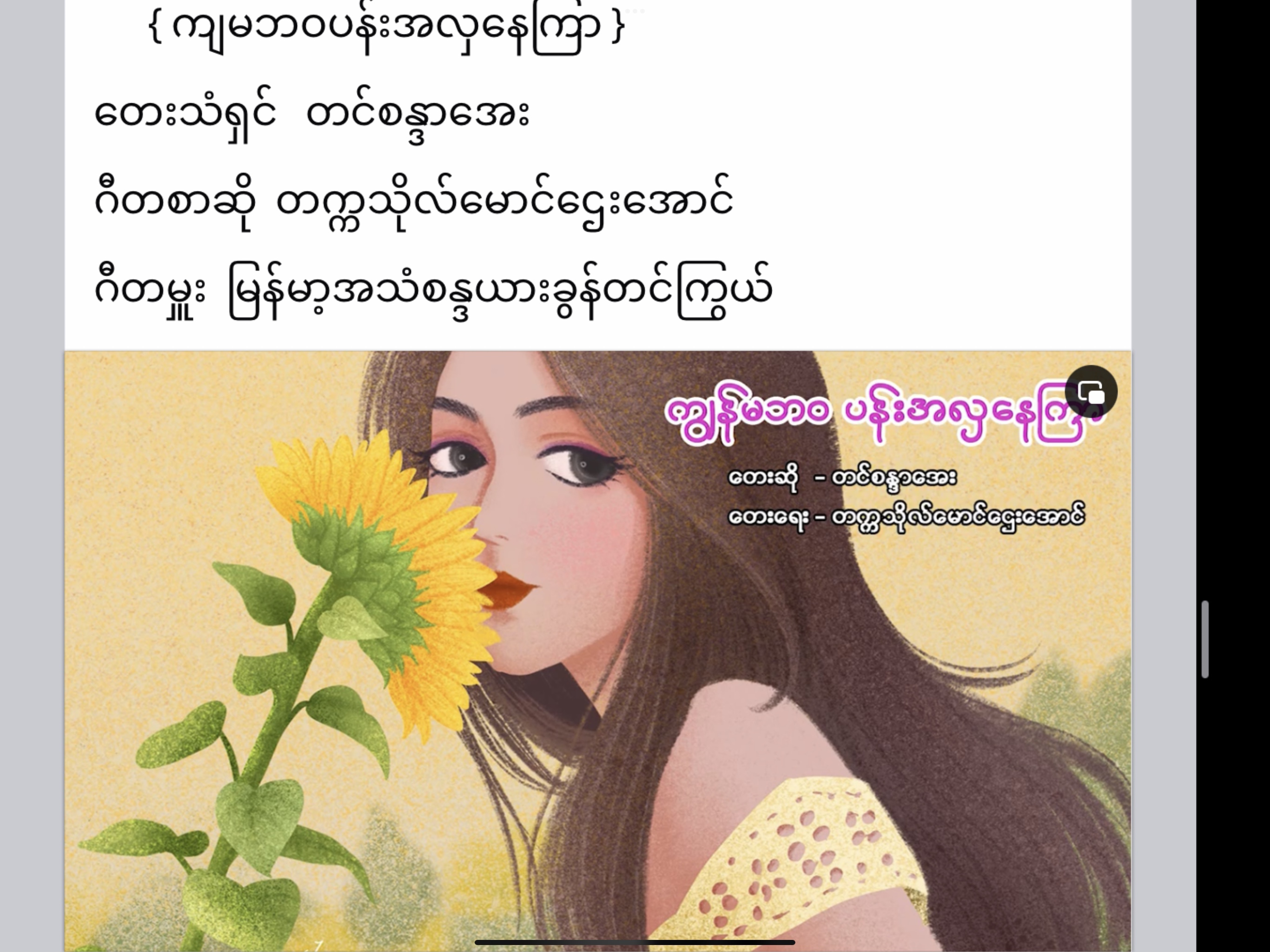 ( ရေကန်တွင်းကိုပြန်မဆင်း ရင်တွင်းမချိသမျှ တမိခင်ခြေဖဝါး မြေသားတွင်အပင်ဖြစ်အမြစ်တွယ် ချစ်စဖွယ်မျက်နှာဝိုင်းဝိုင်းလေးခမျာ နေကြာပန်းလေးဖြစ်သွားရှာသတဲ့ကွယ် )