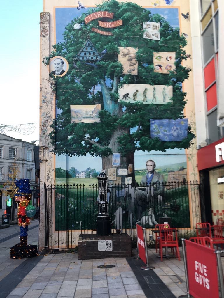 Charles Darwin အကြောင်း ပနိးချီ ဆွဲ ထားတဲ့ ကြော်ငြာ ဆိုင်း ဘုတ် ကြီး တစ်ခုတွေ့ခဲ့တာကြာပြီ.