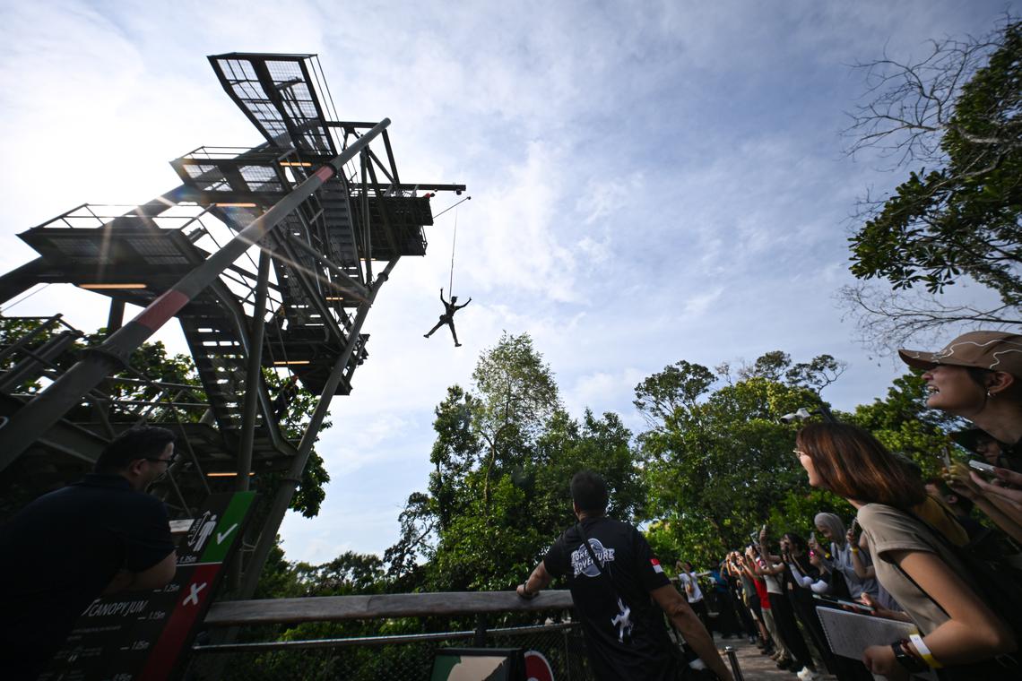 Step off a 13m or 20m platform for a stimulated free fall while taking in stunning vistas of the rainforest at the Canopy Jump. ST PHOTO: LIM YAOHUI