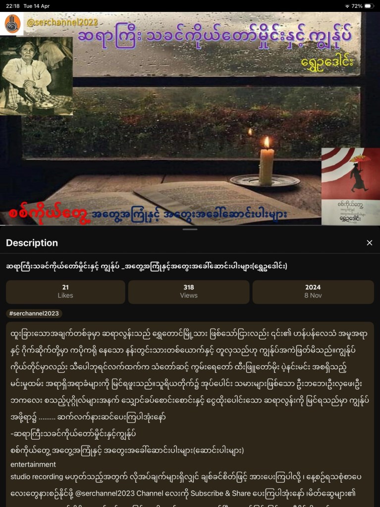 studio recording မဟုတ်သည့်အတွက် လိုအပ်ချက်များရှိလျှင် ချစ်ခင်စိတ်ဖြင့် အားပေးကြပါလို့ ၊ နေ့စဉ်ရသစုံစာပေလေးတွေနားစဉ်နိုင်ဖို့ @serchannel2023 Channel လေးကို Subscribe & Share ပေးကြပါအုံးနော် ၊မိတ်ဆွေများ၏ အားပေးမှုများသည် မိမိအတွက် ခွန်အားဖြစ်စေပါသည်။VPN လေးဖွင့်ပြီး နားစဉ်ခြင်းဖြင့် ကူညီနိုင်ပါသည်။အားပေးကြတဲ့ တစ်ဦးတစ်ယောက်ချင်းစီတိုင်းကို ကျေးဇူးတင်ရှိပါသည်။မူရင်းစာအုပ်အား ဖတ်ရှုပေးပါခင်ဗျာ။