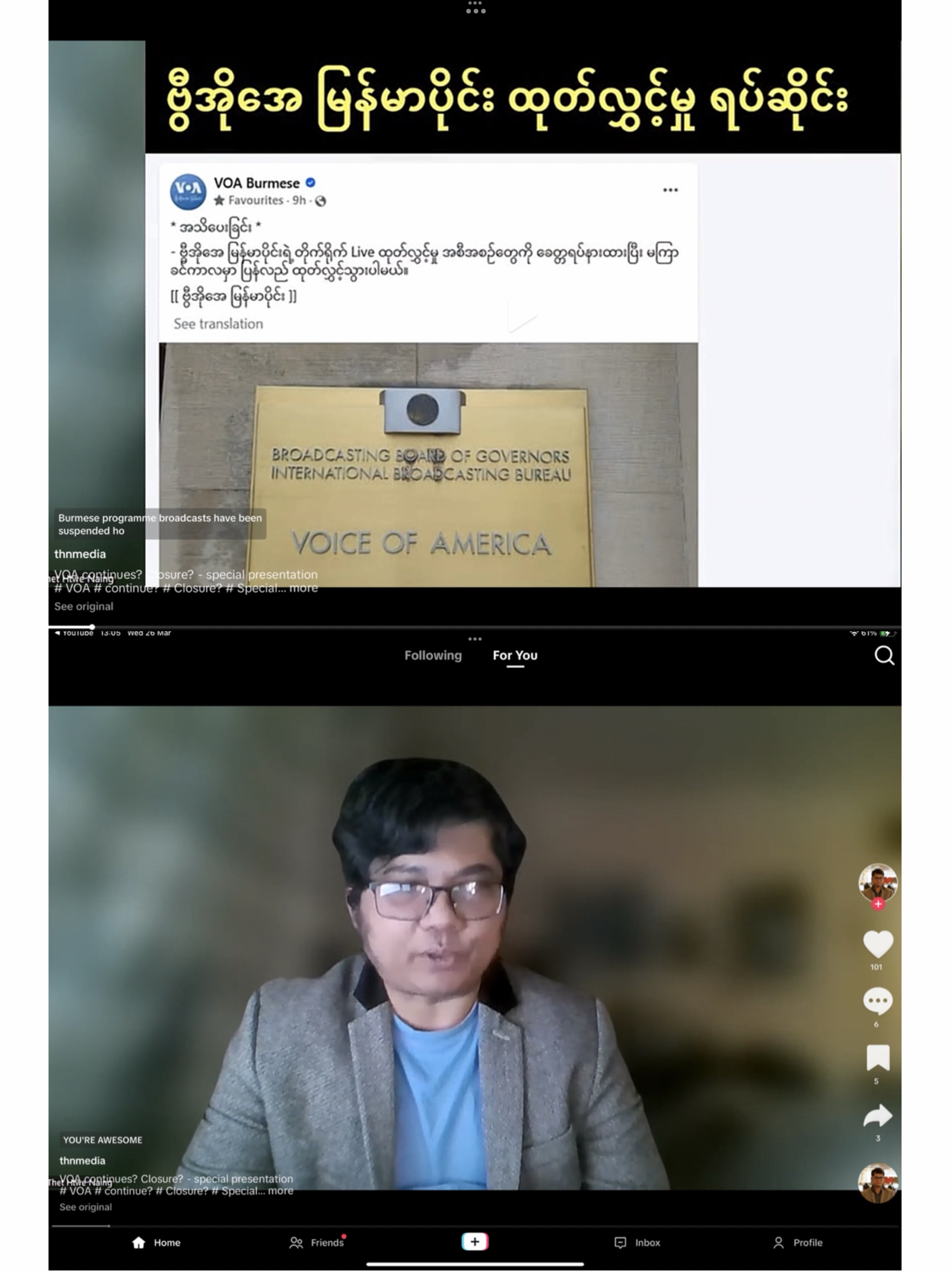 VOA Continue ? Or Closure ? Voice of VOA Myanmar News Announcer. https://vt.tiktok.com/ZSr87h4s6/. By thnmedia