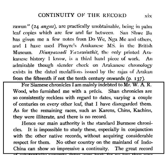 “မြန်မာရာဇဝင်တွေဟာ အရေအတွက်ရော(quantity)၊အရည်အသွေး(quality)အရပါ ကျန်တဲ့ အင်ဒိုချိုင်းနား၊အရှေ့တောင်အာရှ ဒေသနေ နိုင်ငံတွေထက် သာလွန်တယ်။ ထို့ကြောင့် မြန်မာမှတ်တမ်းကို အဓိကစံအဖြစ်ပုံ။ အခြားအင်ဒိုချိုင်းနား၊အရှေ့တောင်အာရှနိုင်ငံများတွင် မြန်မာမှတ်တမ်းများကဲ့သို့ အထင်ကြီးလောက်သည့် မှတ်တမ်းမရှိပုံ”ကို သူ၏ ‘History of Burma’စာအုပ်တွင် မှတ်ချက်ပြုပါတယ်။