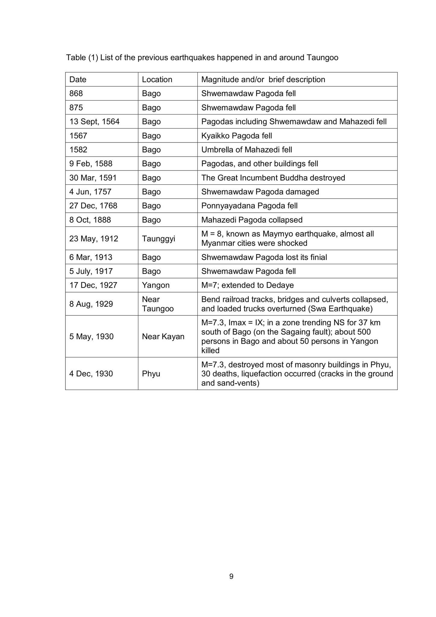 • Table 1 lists significant earthquakes in and around Taungoo, highlighting damages to notable structures like the Shwemawdaw Pagoda.