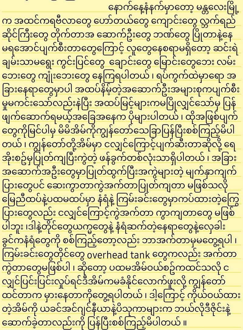 N. Khan Aung fb 8 April2025 post Sky Villa ဆောက်တုန်းက ကျနော်လည်း ကဏ္ဍတစ်ခုကနေ ပါဝင်ခဲ့ဖူးပါတယ် ၊ ၂၀၁၄ လောက်က စဆောက်ခဲ့ကြတာပါ ၊ ဆောက်လုပ်ရေးဆိုင်ရာပညာရပ်တွေကို ပညာရှင်တွေလောက်တော့ ကျနော်နားမလည်ပါဘူး ၊ ဒါပေမဲ့ ရွှံမြေ မြေပျော့ကို အသေအချာမပြုပြင်ပဲ မြေဖို့ပြီးဆောက်ခဲ့တာတွေ ဘေးမှာရေစစ်ကန်ကြီးရှိနေတာကိုကြည့်ပြီး ဒါကြီးကငလျင်နဲနဲကြမ်းတာနဲ့ ကြွမှာပဲလို့ ခန့်မှန်းခဲ့ဖူးပါတယ်