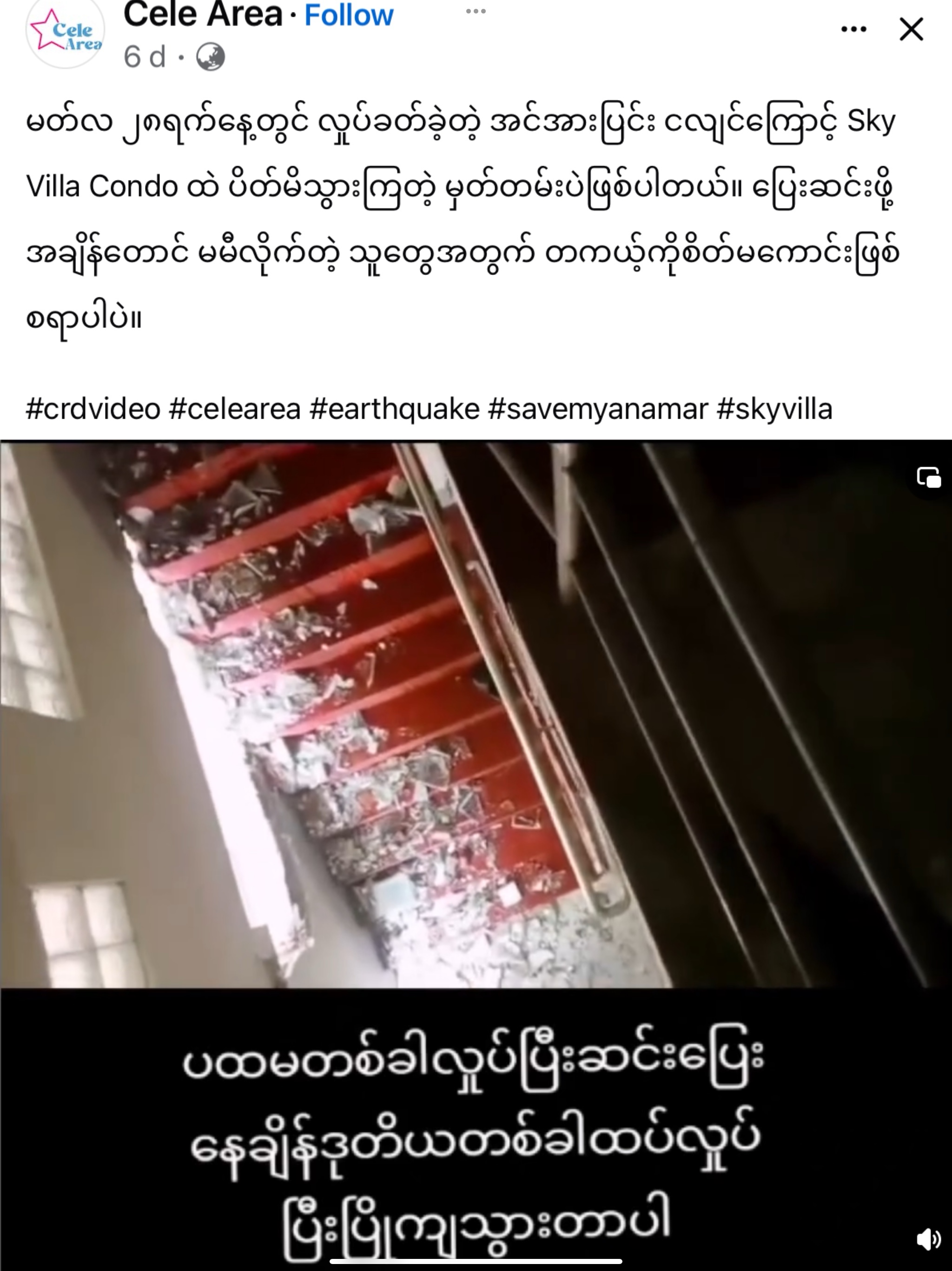 Great Wall Hotel မှ လွတ်မြောက်လာသူ နှစ်ဦး ရဲ့စကားများ Great Wall Hotel ပြိုကျသွားတဲ့အချိန်မှာ ညီမက မြေညီထပ်က ရုံးခန်းထဲမှာ ပြေးချိန်တောင် မရှိခဲ့ဘူး။ အဲ့အချိန်မှာ ငါသေတော့မှာလားဆိုတာထက်မိဘတွေရဲ့ မျက်နှာကို အရင်ဆုံးပြေးမြင်မိတယ်။ ကြောက်စိတ် လည်း မရှိတော့ဘူး” လို့ ပြောလာတဲ့ Great Wall Hotel မှ လွတ်မြောက်လာသူ နှစ်ဦးရဲ့ စကားသံများ… CG #CeleGabar #ဆယ်လီကမ္ဘာ #ဆယ်လီသတင်း #myanmarcelenews #MyanmarEarthquake #ငလျင်၂၀၂၅ #MyanmarEarthquake2025 #GreatWallHotel #လွတ်မြောက်လာသူ