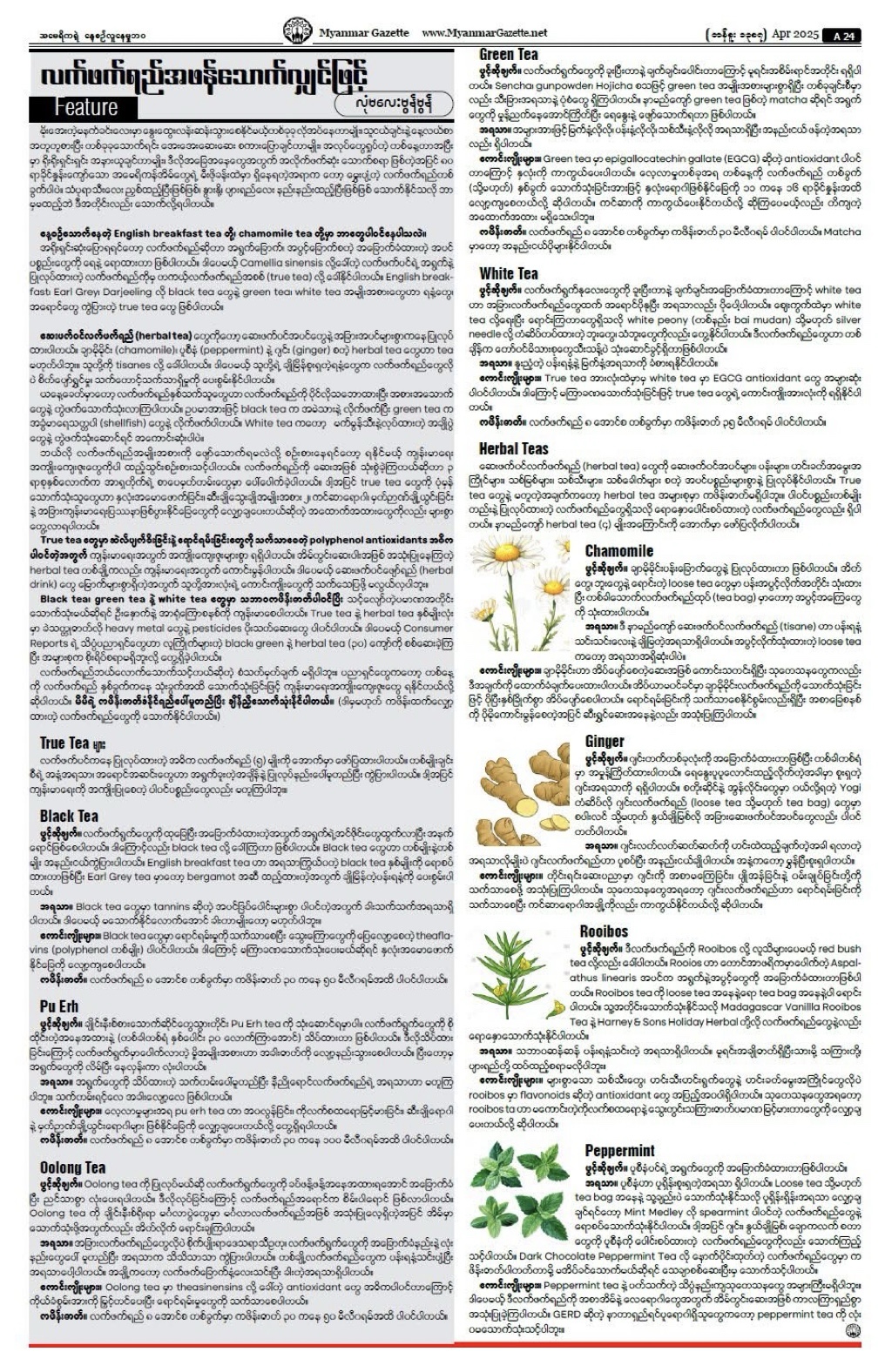 နေ့စဉ်သောက်နေတဲ့ English breakfast tea တို့၊ chamomile tea တို့မှာ ဘာတွေပါဝင်နေပါသလဲ။ အရိုးရှင်းဆုံးပြောရရင်တော့ လက်ဖက်ရည်ဆိုတာ အရွက်ခြောက်၊ အပွင့်ခြောက်စတဲ့ အခြောက်ခံထားတဲ့ အပင်ပစ္စည်းတွေကို ရေနဲ့ ရောထားတာ ဖြစ်ပါတယ်။ ဒါပေမယ့် Camellia sinensis လို့ခေါ်တဲ့ လက်ဖက်ပင်ရဲ့ အရွက်နဲ့ ပြုလုပ်ထားတဲ့ လက်ဖက်ရည်ကိုမှ တကယ့်လက်ဖက်ရည်အစစ် (true tea) လို့ ခေါ်နိုင်ပါတယ်။ English breakfast၊ Earl Grey၊ Darjeeling လို black tea တွေနဲ့ green tea၊ white tea အမျိုးအစားတွေဟာ ရနံ့တွေ၊ အရောင်တွေ ကွဲပြားတဲ့ true tea တွေ ဖြစ်ပါတယ်။