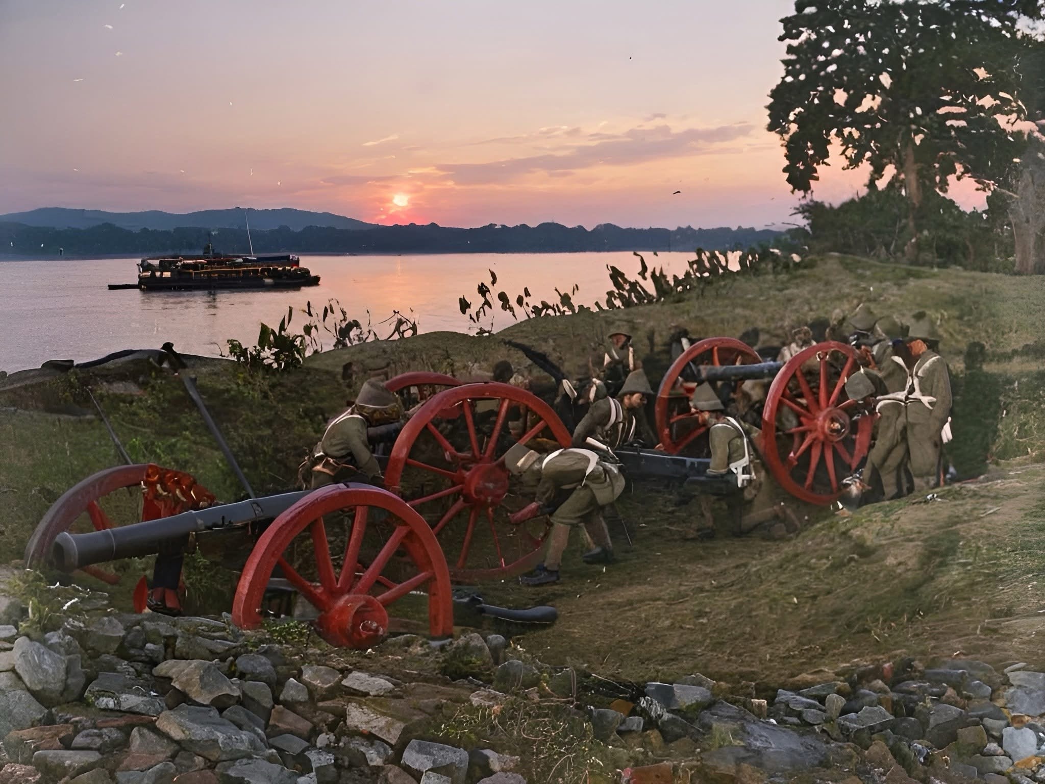 British soldiers dismantling captured Burmese cannons, 1885. Black and white photo from Nick Britten.