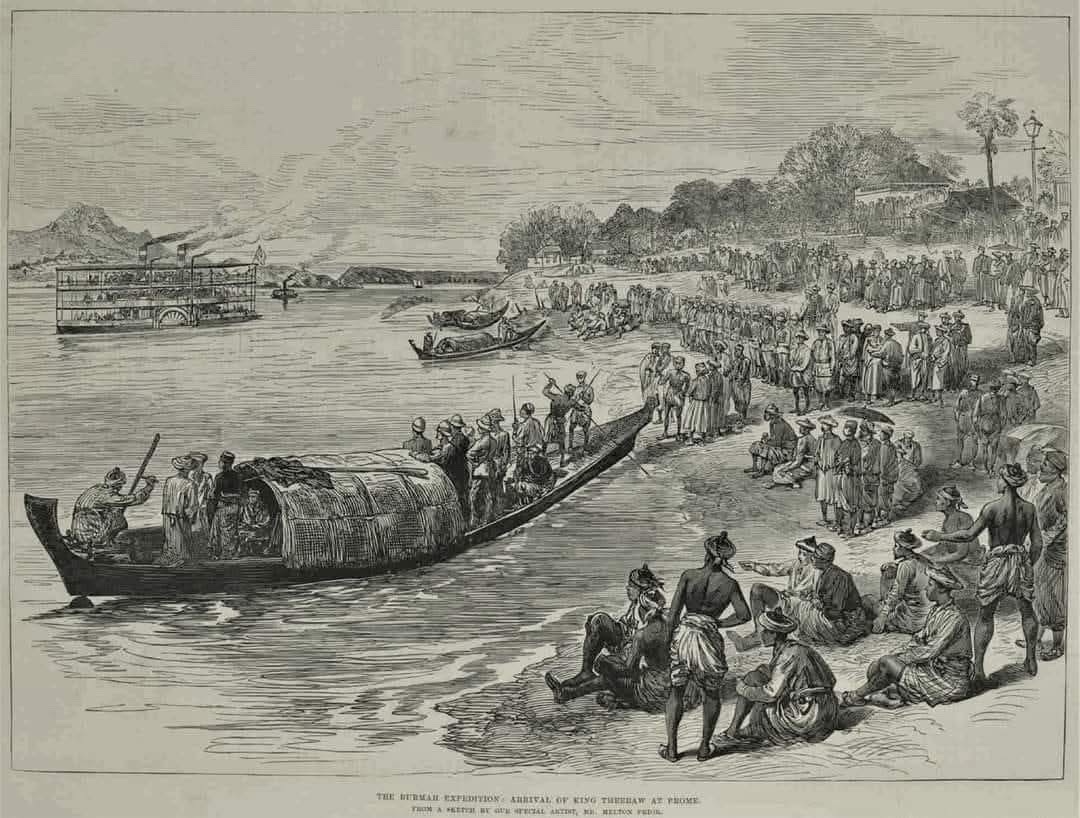 သီပေါမင်းကို ခေါ် ဆောင်လာသော သူရိယ သင်္ဘော ပြည်မြို့သို့ ရောက်ရှိလာစဥ်။ ( ဇန်နဝါရီ ၉ ရက် ၊ ၁၈၈၆ The Illustrated London News သတင်းစာ)