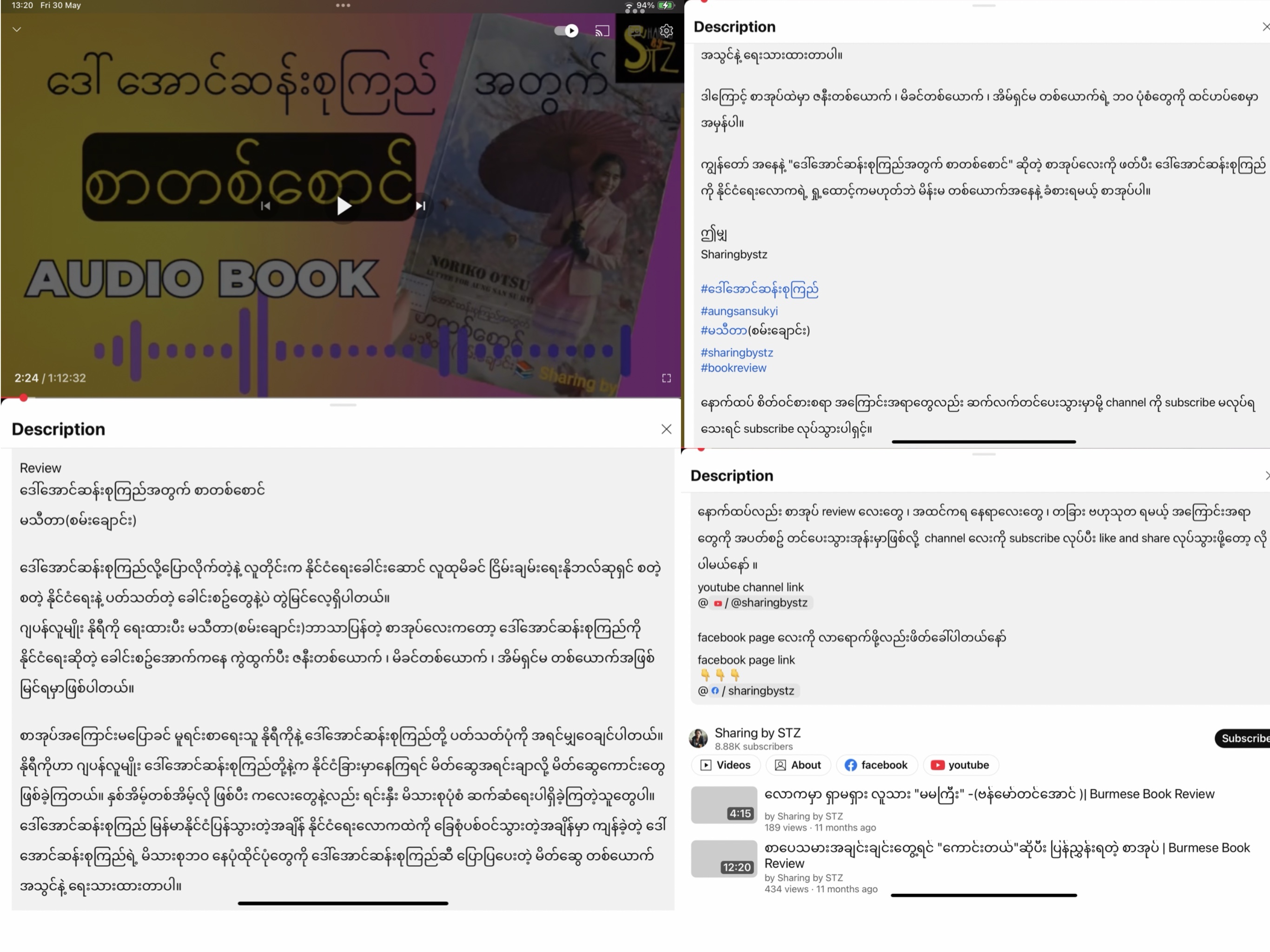 30 May 20254 Jul 2025 uamyint AUNG SAN Suu Ky Audio Books ဒေါ် အောင်ဆန်းစုကြည်အတွက် စာတစ်စောင် ။ မသီတာ(စမ်းချောင်း) မြန်မာဘာသာပြန် ) ေဒါ်အောင်ဆန်းစုကြည်အတွက်။ စာတစ်စောင် မသီတာ(စမိးချောင်း) မြန်မာဘာသာပြန် ) Click to share on Facebook (Opens in new window) Facebook Click to share on X (Opens in new window) X Click to share on LinkedIn (Opens in new window) LinkedIn Click to share on Telegram (Opens in new window) Telegram More Click to share on Tumblr (Opens in new window) Tumblr Like Loading... Related